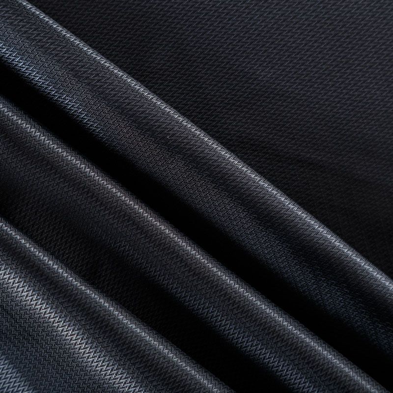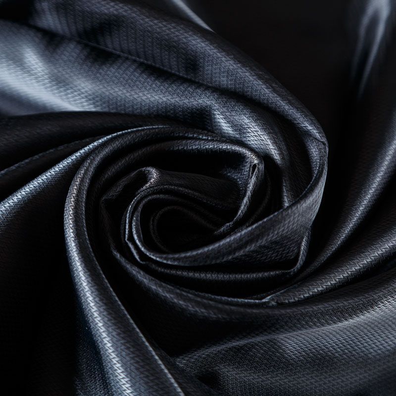 Смесовая подкладочная ткань черного оттенка с мелким жаккардовым геометрическим узором и красивым лоском. Полотно средней плотности, легкое, не просвечивает, хорошо скользит, не тянется. Подойдет для изготовления таких изделий, как пальто, костюмы, куртка, шуба, платье, жакет.