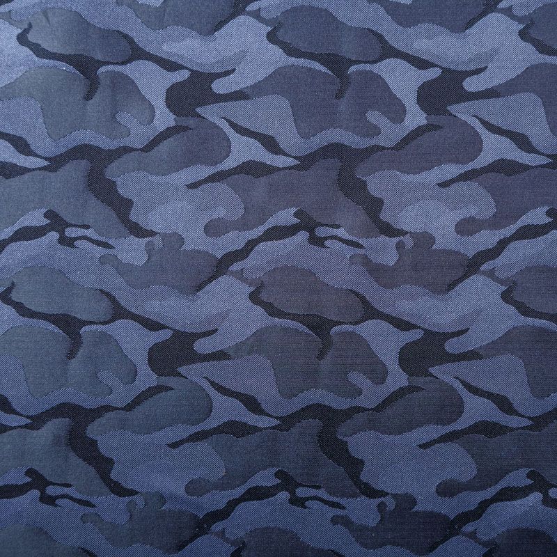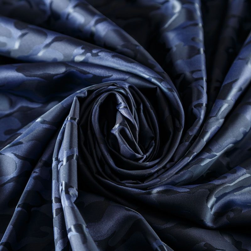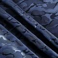 Смесовая подкладочная ткань синего оттенка с жаккардовым камуфляжным узором и красивым лоском. Полотно средней плотности, легкое, не просвечивает, хорошо скользит, не тянется. Подойдет для изготовления таких изделий, как пальто, костюмы, куртка, шуба, платье, жакет.