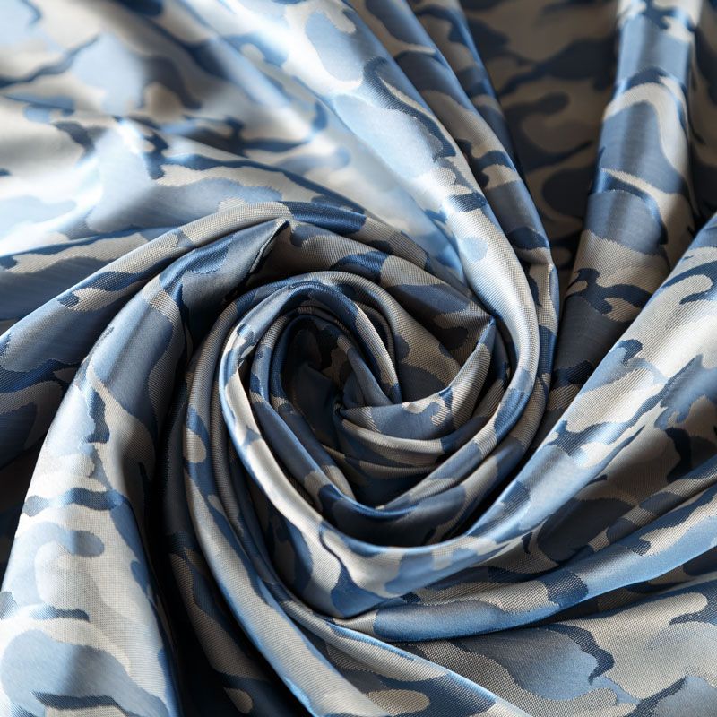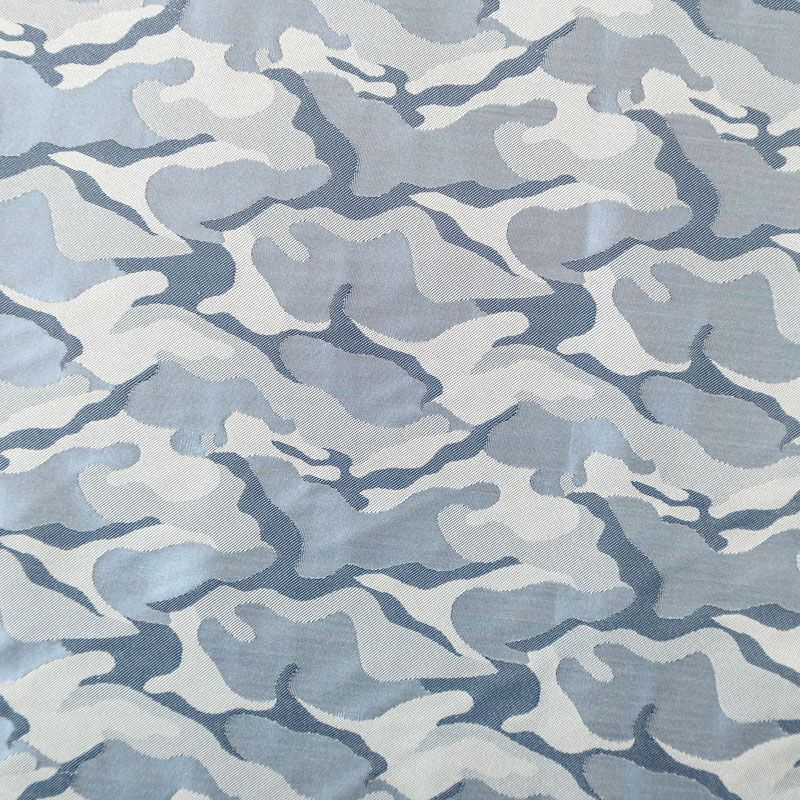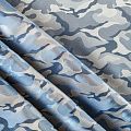 Смесовая подкладочная ткань серо-голубого оттенка с жаккардовым камуфляжным узором и красивым лоском. Полотно средней плотности, легкое, не просвечивает, хорошо скользит, не тянется. Подойдет для изготовления таких изделий, как пальто, костюмы, куртка, шуба, платье, жакет.