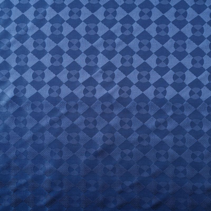 Смесовая подкладочная ткань синего оттенка с жаккардовым геометрическим узором и красивым лоском. Полотно средней плотности, легкое, не просвечивает, хорошо скользит, не тянется. Подойдет для изготовления таких изделий, как пальто, костюмы, куртка, шуба, платье, жакет.