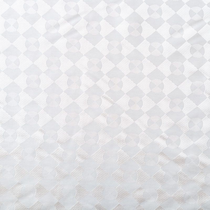 Смесовая подкладочная ткань белого оттенка с жаккардовым геометрическим узором и красивым лоском. Полотно средней плотности, легкое, не просвечивает, хорошо скользит, не тянется. Подойдет для изготовления таких изделий, как пальто, костюмы, куртка, шуба, платье, жакет.