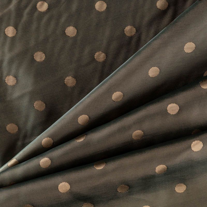 Подкладочная ткань легкая, с жаккардовым "горохом" пыльного серо-зеленого оттенка, с красивым блеском. Не  просвечивает, хорошо скользит. Подойдет для изготовления таких изделий, как пальто, костюмы, куртка, шуба, платье, жакет.