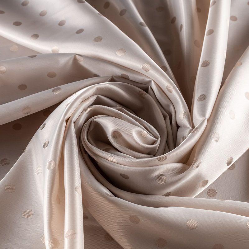Подкладочная ткань легкая, с жаккардовым "горохом" благородного кремового оттенка, с красивым блеском. Не  просвечивает, хорошо скользит. Подойдет для изготовления таких изделий, как пальто, костюмы, куртка, шуба, платье, жакет.