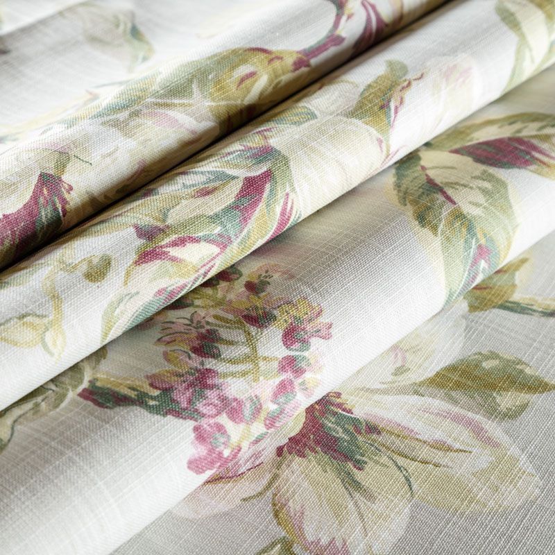 Хлопковая портьерная ткань с растительным принтом в розово-зеленых оттенках на светлом сером фоне. Ткань средней плотности, без блеска, хорошо драпируется, имеет полонтяное переплетение. Можно использовать для пошива портьер, римской шторы, салфеток, столового белья, подушек, покрывал и других предметов текстильного интерьера.