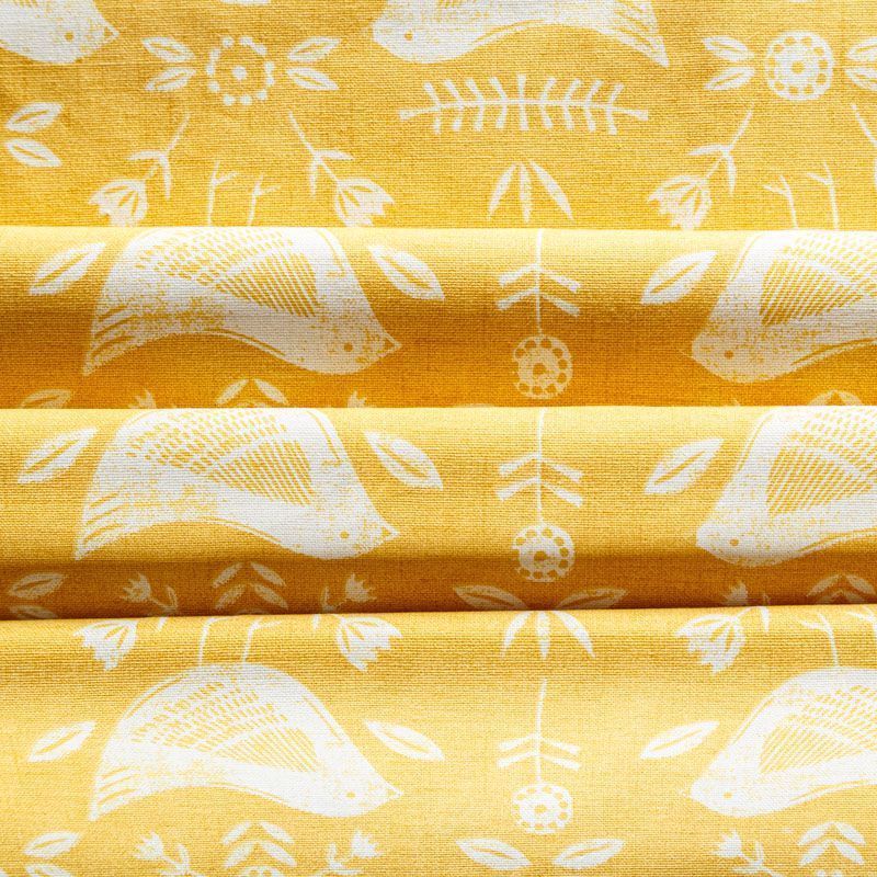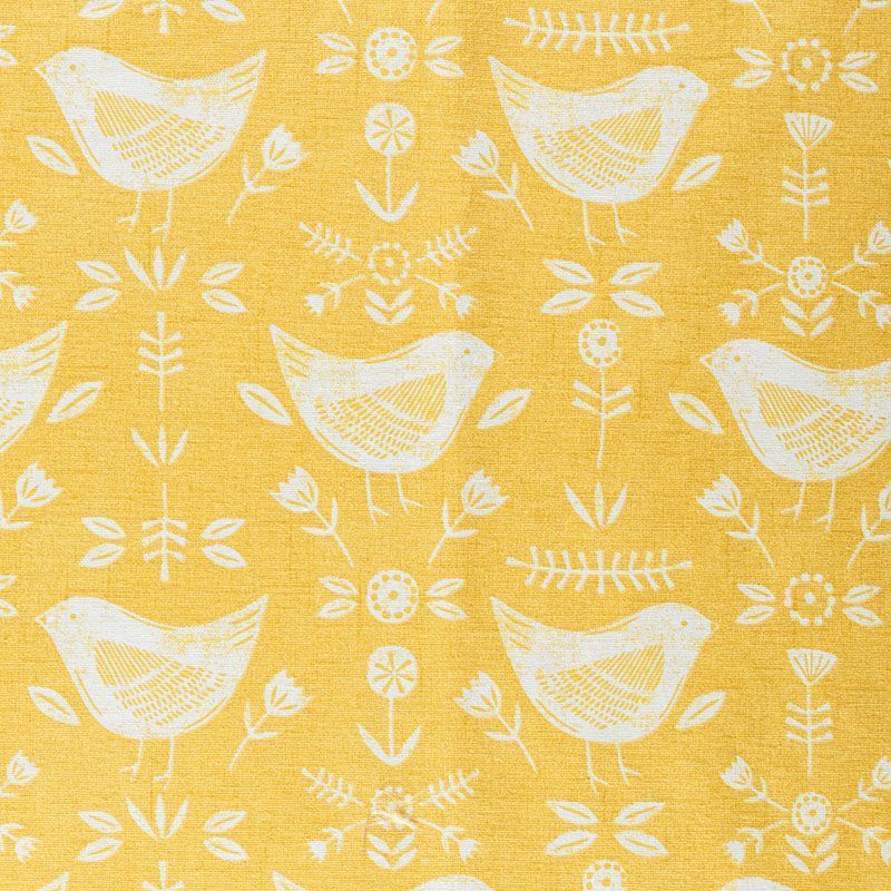 Хлопковая портьерная ткань Нарвик из коллекции Сканди английского производителя Fryett's Fabric. На желтой текстурированной основе наснесен принт в виде белых стилизованных птиц и цветов. Ткань средней плотности, прекрасно держит форму, драпируется в устойчивые складки. Подойдет для классических портьер, римских штор, покрывал, подушек, скатертей, салфеток и других элементов текстильного интерьера как в самостоятельном исполнении, так и качестве компаньона к однотонным варинтам.