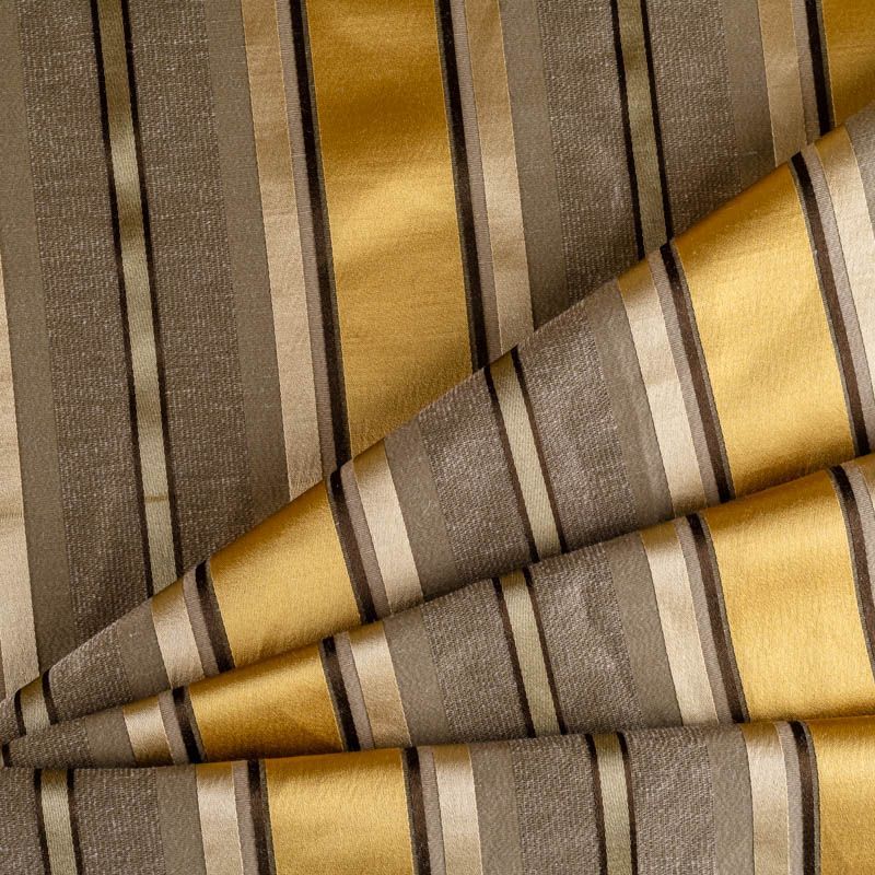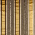 По своей структуре шелковые портьерные ткани являются мягким и красивым материалом, способным отражать свет. Изделия из шелка удивительно переливаются и блестят, придавая интерьеру помещения особую атмосферу и вид. Такие портьерные ткани лучше всего применять для создания покрывал, наволочек, штор, легких, воздушных и светлых – они отлично подойдут для затемненных мест либо закрытых окон. Ткань имеет вертикальные полосы в разных оттенках золотисто-бежевого цвета, а так же сочетает в себе чередование полос матовой и блестящей текстур.