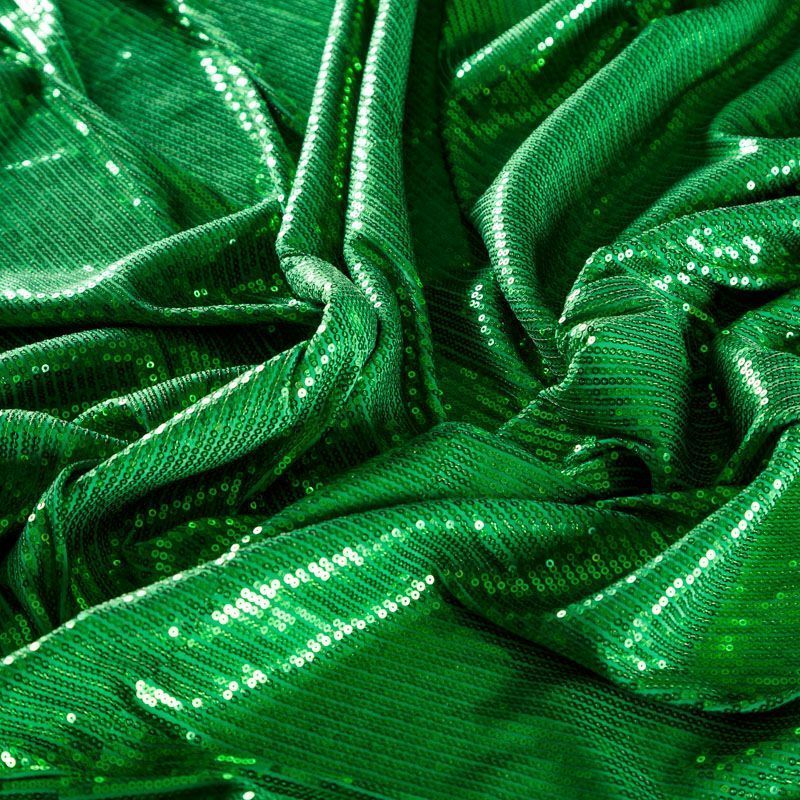 Блестящие пайетки сочного зеленого оттенка. Мелкие, размером около 3 мм. Основа - трикотажное полотно, комфортное в носке. Ткань не прозрачная, тянется. Подойдет для вечернего коктельного платья или юбки, комбинезона, топа, танцевальных и сценических костюмов.