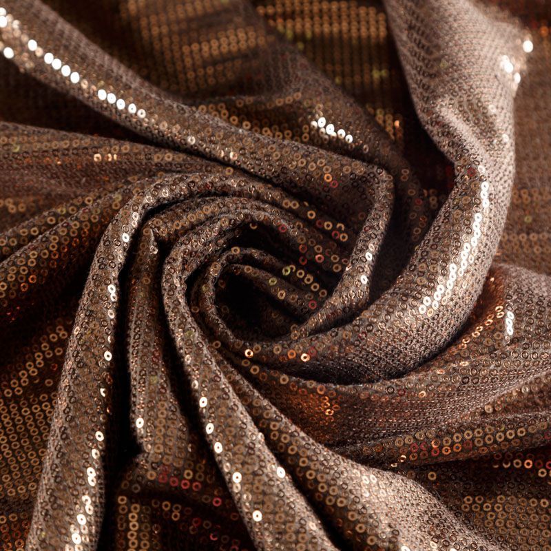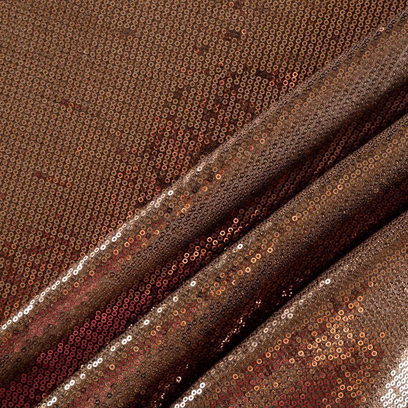 Блестящие пайетки оттенка горячего молочного шоколада. Мелкие, размером около 3 мм. Основа - трикотажное полотно, комфортное в носке. Ткань не прозрачная, тянется.  Подойдет для вечернего коктельного платья или юбки, комбинезона, топа, танцевальных и сценических костюмов.