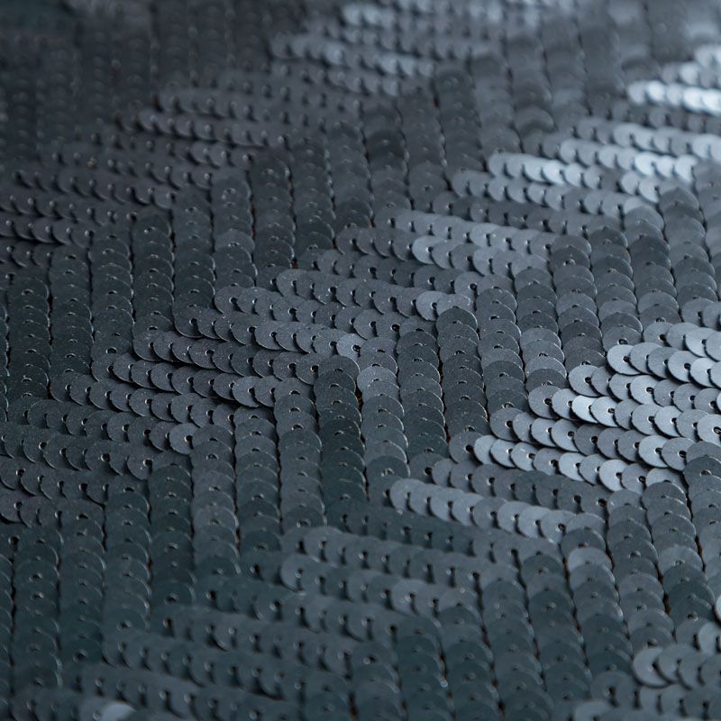 Двухсторонние пайетки на трикотажной сетчатой основе иссиня-черного оттенка образуют узор в виде полоски и елочки. Пайетки среднего размера, с умеренным блеском. Полотно мягкое и пластичное, хорошо тянется, благодаря этому изделия получаются удобными и великолепно садятся по фигуре. Отлично подойдет для пошива  вечерних нарядов, костюмов для концертных выступлений, а также для танцев и гимнастики.