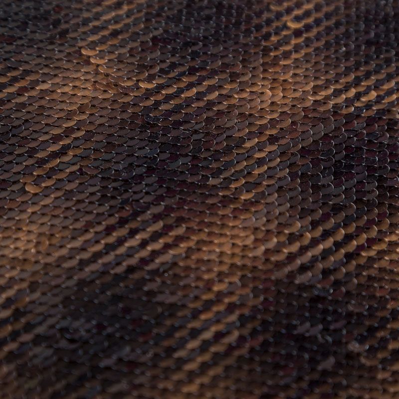 Мелкие глянцевые пайетки на плотной трикотажной основе образуют геометрический двухцветный орнамент. Ткань не просвечивается, пластичная, хорошо драпируется. Идеальный вариант для праздничных и вечерних образов: платья, костюма, юбки, широких брюк, топа, туники, а также для одежды в стиле спорт-шик.