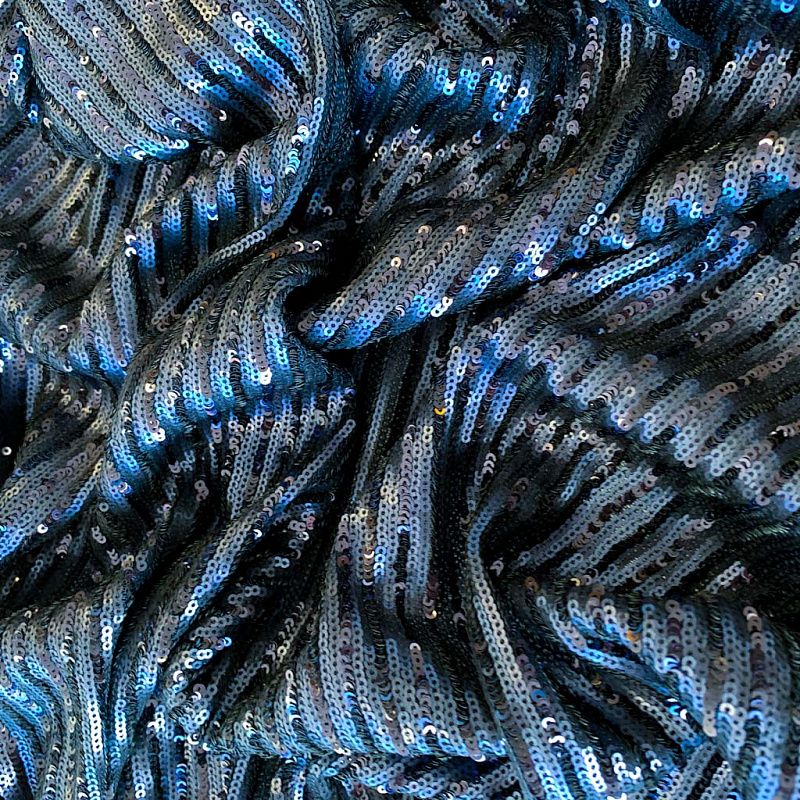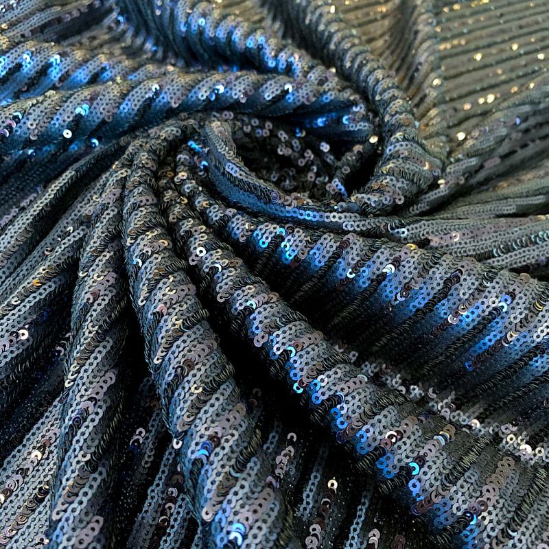 Пайетки на плотной сетчатой основе в тонкую чередующуюся полоску глянцевых и матовых блесток. Полоска расположена поперек полотна. Ткань хорошо драпируется, красиво переливается, имеет глянцевый блеск. Немного тянется, благодаря чему изделия получаются комфортными и отлично сидят по фигуре. Пайетки — идеальный материал для праздников и вечеринок. Из них получится эффектное платье, туника, юбка или комбинезон.