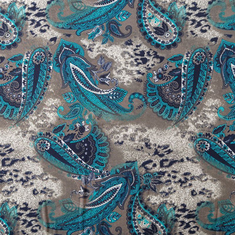 "Холодный" трикотаж с бирюзовым узором пейсли, средней плотности, хорошо тянется за счет эластана в составе. Ткань не сухая, мягкая, не просвечивает, хорошо драпируется. Отлично подойдет для пошива платья, туники, лонгслива, топа, юбки.