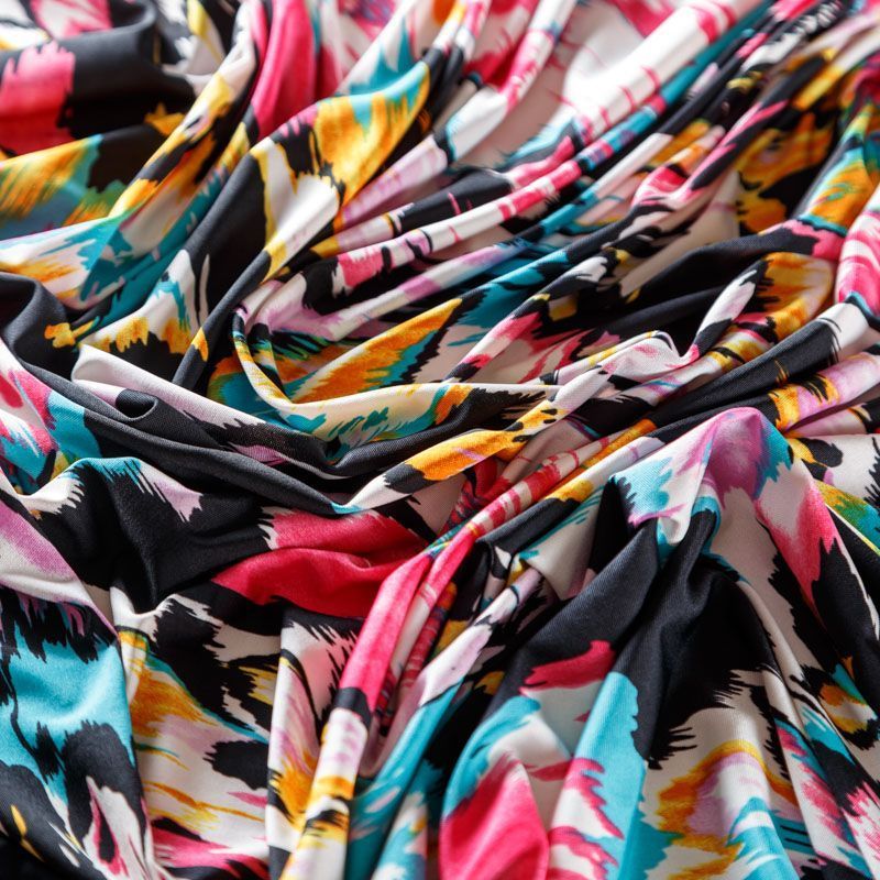 "Холодный" трикотаж средней плотности черного цвета с ярким принтом, хорошо тянется за счет эластана в составе. Ткань не сухая, мягкая, не просвечивает, хорошо драпируется. Отлично подойдет для пошива платья, туники, лонгслива, топа, юбки.