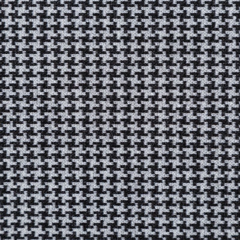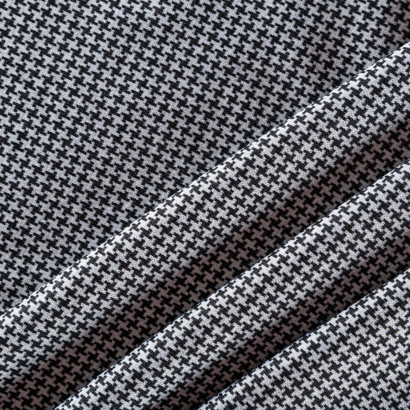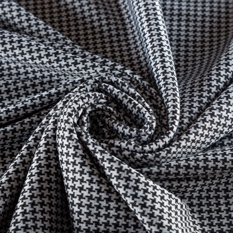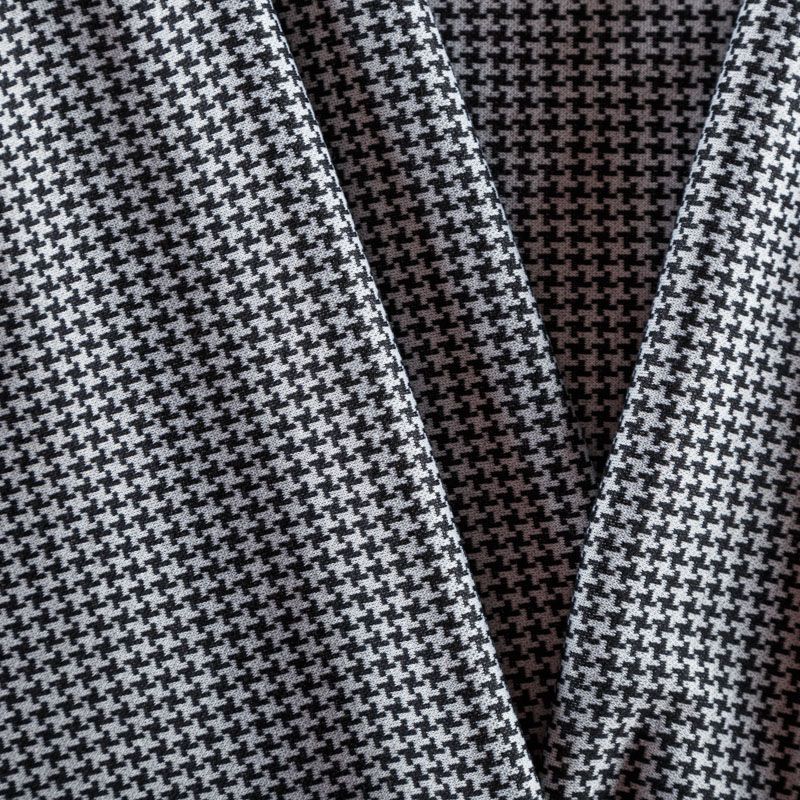 Трикотаж средней толщины, хорошо тянется за счет эластана в составе. Мелкий ненавязчивый геометрический орнамент образуется переплетением черных и белых нитей. Ткань не сухая, мягкая, но плотная, не просвечивает, теплая, хорошо драпируется. Отлично подойдет для пошива легкой верхней одежды, жакетов, костюмов, юбок.