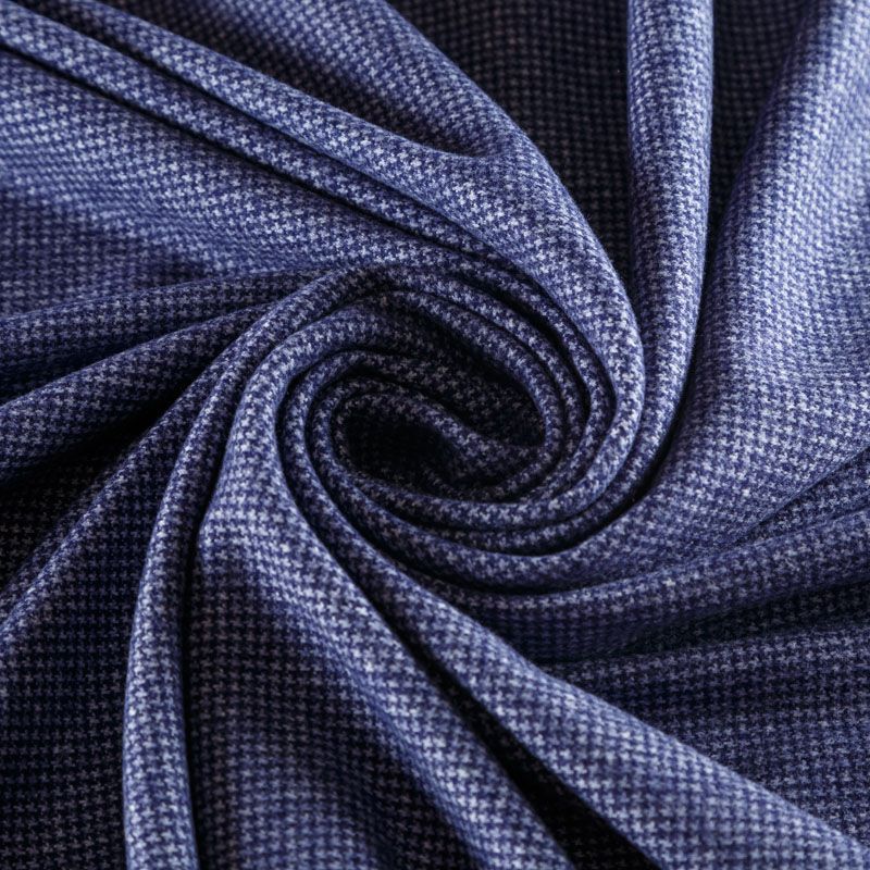 Трикотаж средней толщины, хорошо тянется за счет эластана в составе. Мелкий ненавязчивый узор "гусиная лапка" образуется переплетением фиолетово-синих и белых нитей. Ткань не сухая, мягкая, но плотная, не просвечивает, теплая, хорошо драпируется. Отлично подойдет для пошива легкой верхней одежды, жакетов, костюмов, юбок.