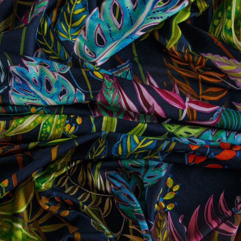 Итальянский мягкий хлопковый трикотаж черного цвета с ярким разноцветным тропическим принтом, гладкий, с красивым лоском. Материал очень приятный на ощупь, достаточно плотный, но при этом тонкий, просвечивает только при растяжении, сминается, но восстанавливется. Отлично тянется за счет плетения и содержания эластана. Отлично подойдет для пошива летних костюмов, топов, майки, футболки, платья, домашней одежды.