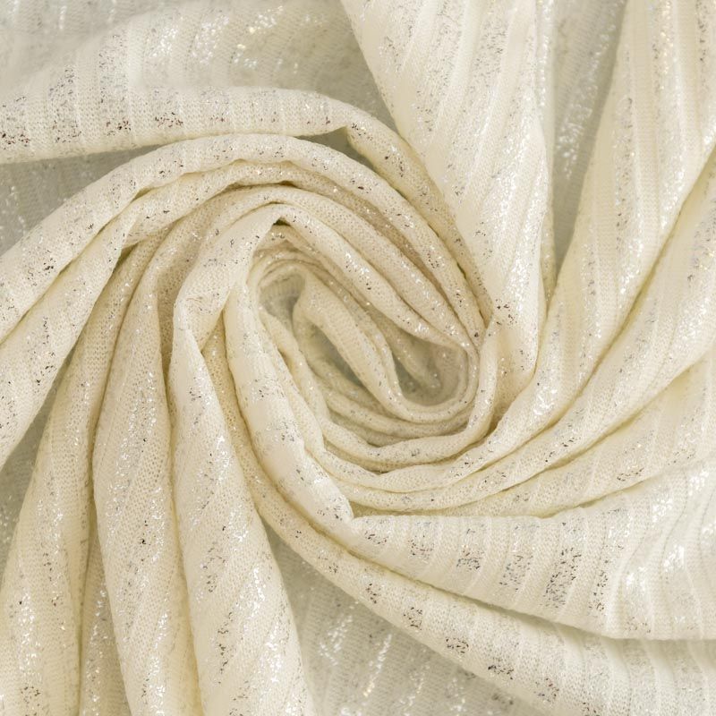 Трикотаж-лапша средней плотности, с высокой степенью эластичности, поверхность рельефная за счет эффекта резинки и мерцающая за счет металлизированного напыления. С изнанки трикотаж гладкий, комфортный, подходит для использования без подклада. Сшить из такого полотна можно водолазки, платья, топы, юбки, комплекты, нарядные изделия. Направление полос - вдоль линии кромки.