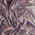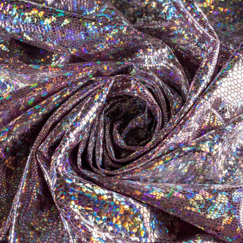 Эффектное трикотажное полотно с напыленными разноцветными блестками. Поверхность фактурная с рисунком под рептилию, который не деформируется при растяжении трикотажа. Материал очень пластичный, образует струящиеся мягкие складки, отлично тянется, не просвечивает, не мнется. Изнаночная сторона матовая, приятная на ощупь. Идеальный выбор для нарядных моделей, гимнастических и танцевальных костюмов.