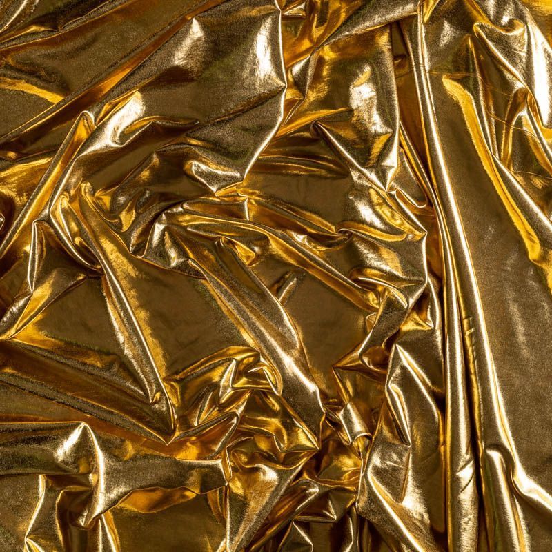Эффектное трикотажное полотно с золотым металлическим блеском. Материал очень пластичный, образует струящиеся мягкие складки, отлично тянется, не просвечивает, не мнется. Изнаночная сторона матовая, приятная на ощупь. Идеальный выбор для нарядных моделей, гимнастических и танцевальных костюмов.