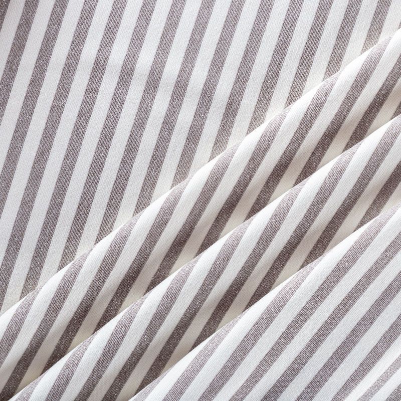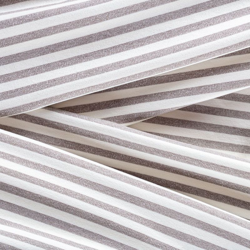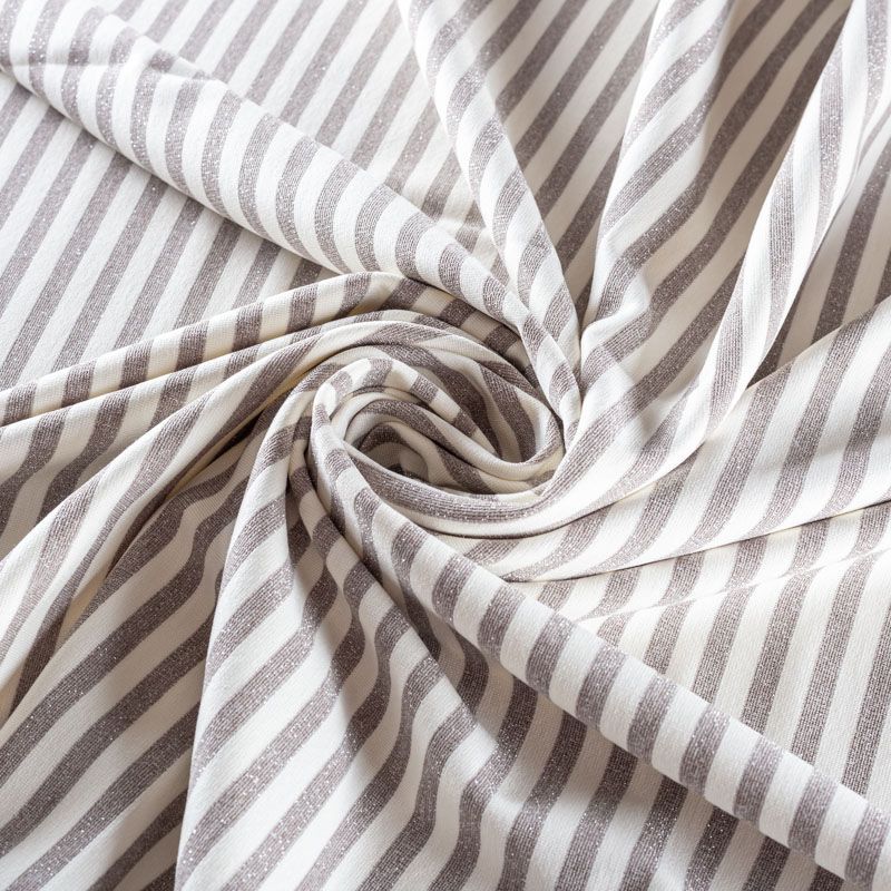 Итальянский трикотаж "пенье" из вискозы в бежево-серую горизонтальную полоску с добавлением люрекса. Поверхность гладкая и матовая. Ткань очень плотная за счет плетения, пластичная, хорошо тянется, не просвечивает. Прекрасно подойдет для пошива лонгслива, футболки, кардигана, платья или юбки в спортивном стиле.