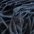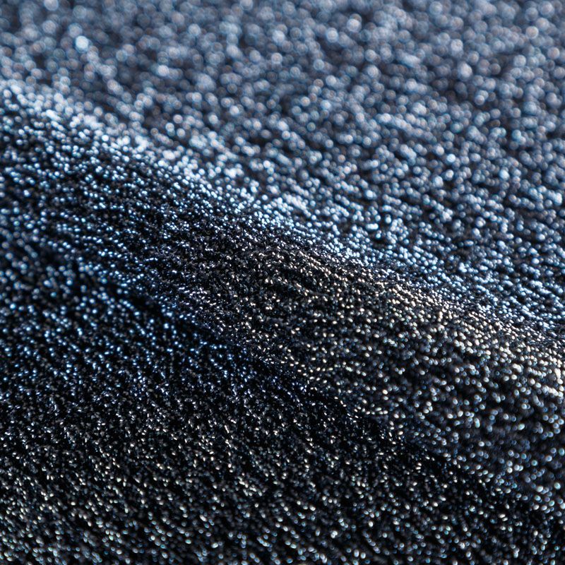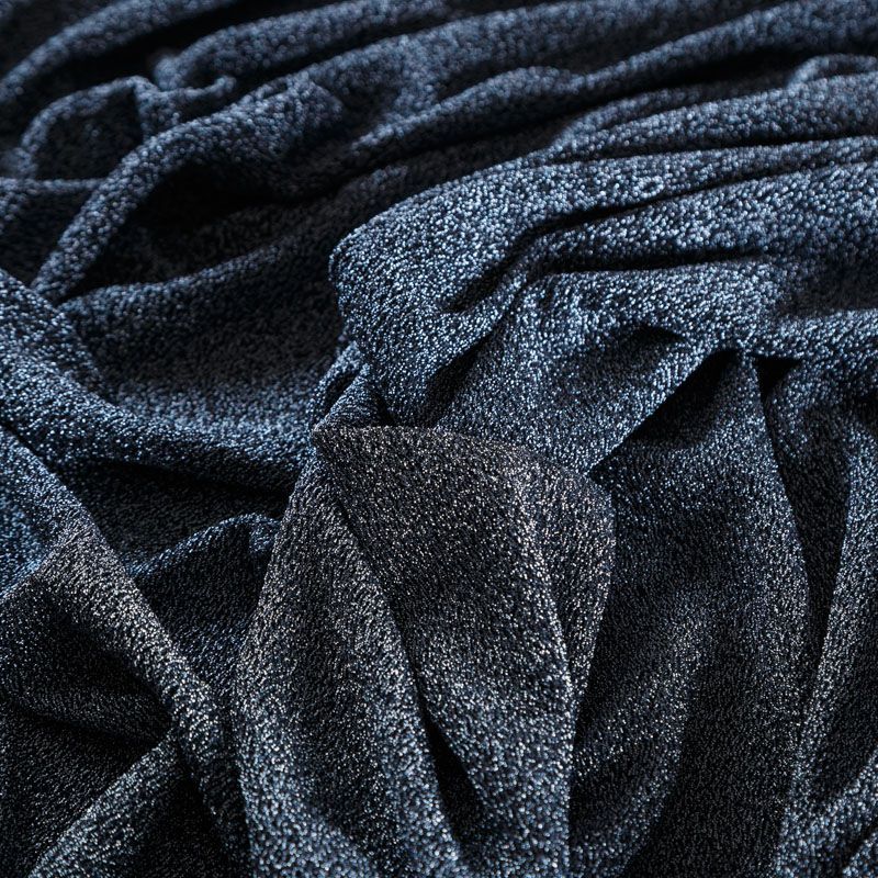 Трикотажное полотно с металлизированным блеском и  мерцанием. Люрексные нити голубого оттенка вплетены в структуру полотна и создают объемный "вспененный" эффект, при этом изнанка гладкая и ровная. Ткань очень приятная к телу, не колется, не просвечивается, очень эластичная, отлично драпируется и ниспадает, красиво ляжет по фигуре. Идеальный вариант для пошива вечерних и нарядных платьев облегающего и свободного силуэта, топов, комбинезона, юбки, широких брюк, туник, кардиганов, накидок.
