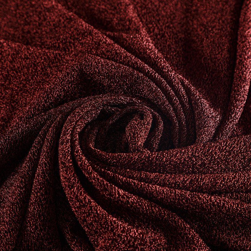 Трикотажное полотно с металлизированным блеском и  мерцанием. Люрексные нити бордового оттенка вплетены в структуру полотна и создают объемный "вспененный" эффект, при этом изнанка гладкая и ровная. Ткань очень приятная к телу, не колется, не просвечивается, очень эластичная, отлично драпируется и ниспадает, красиво ляжет по фигуре. Идеальный вариант для пошива вечерних и нарядных платьев облегающего силуэта, топов, комбинезона, юбки, широких брюк, туник, кардиганов, накидок.