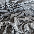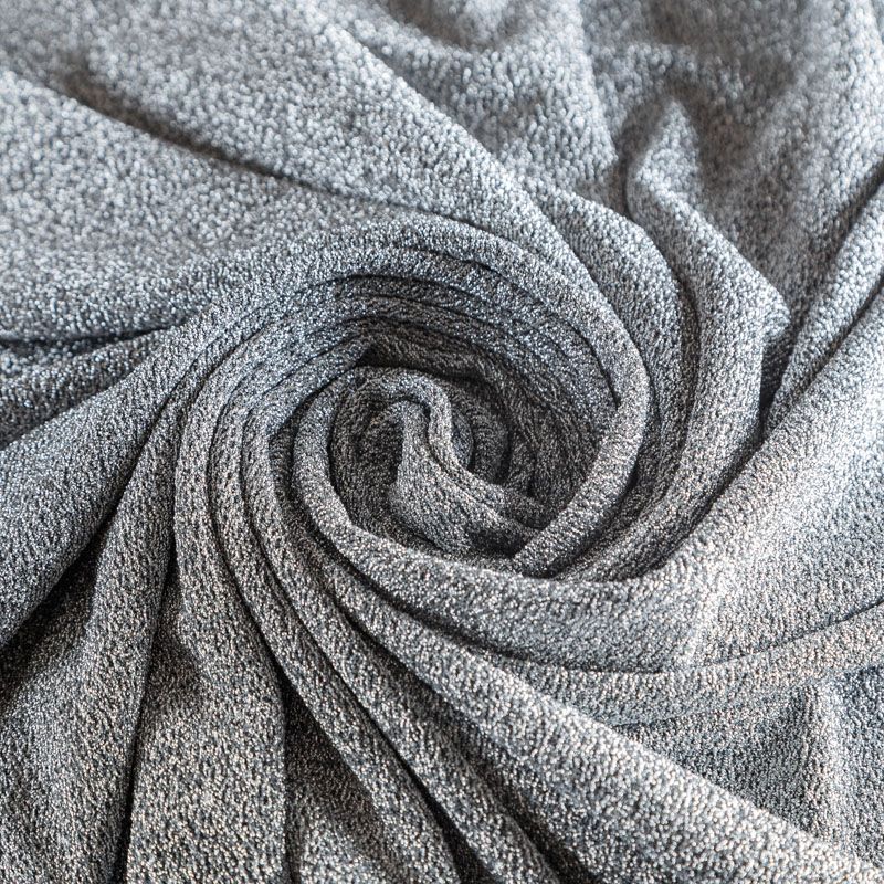 Трикотажное полотно с металлизированным блеском и  мерцанием. Серебристые люрексные нити вплетены в структуру полотна и создают объемный "вспененный" эффект, при этом изнанка гладкая и ровная. Ткань очень приятная к телу, не колется, не просвечивается, очень эластичная, отлично драпируется и ниспадает, красиво ляжет по фигуре. Идеальный вариант для пошива вечерних и нарядных платьев облегающего силуэта, топов, комбинезона, юбки, широких брюк, туник, кардиганов, накидок.