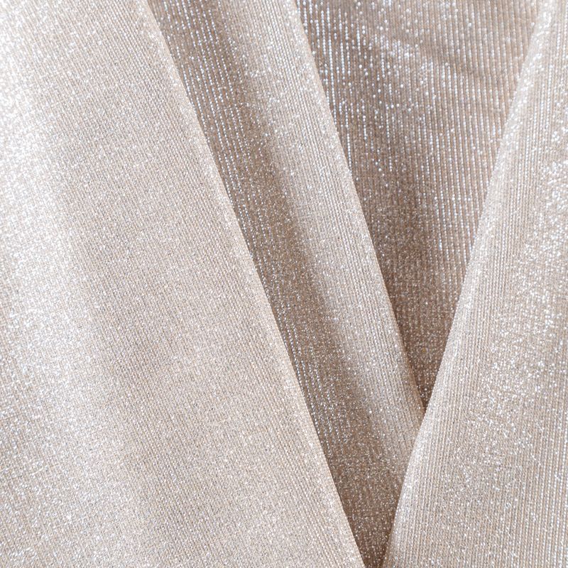 Тонкий и мягкий трикотаж золотистого оттенка с добавлением серебристой люрексной нити. Поверхность шероховатая на ощупь, трикотаж не рыхлый, пластичный, хорошо тянется, не просвечивает. Прекрасно подойдет для пошива лонгслива, гольфа, футболки, кардигана, платья или юбки в спортивном стиле.