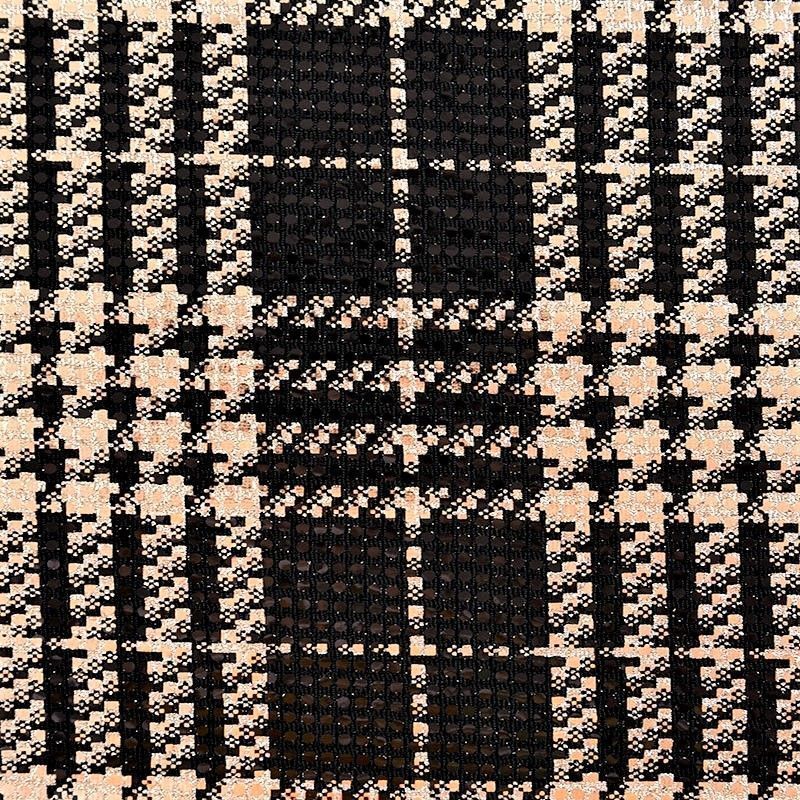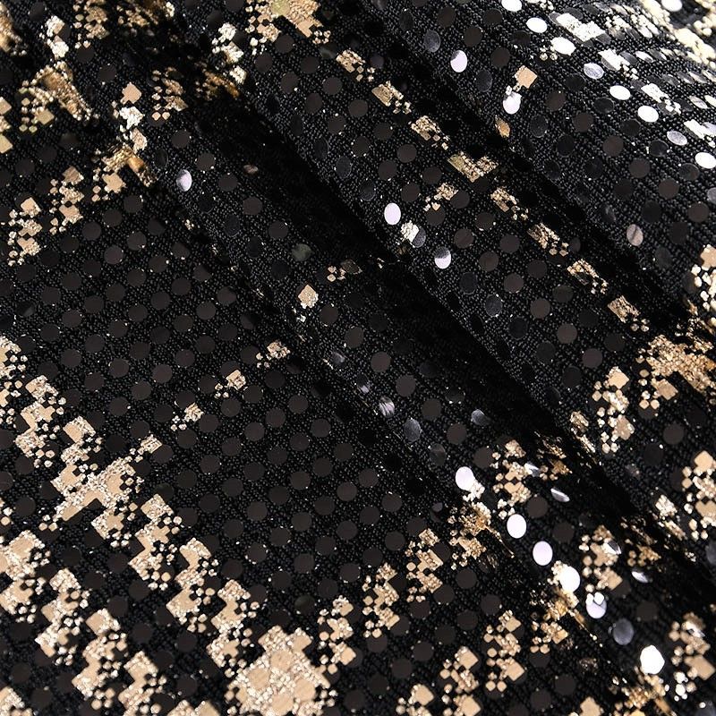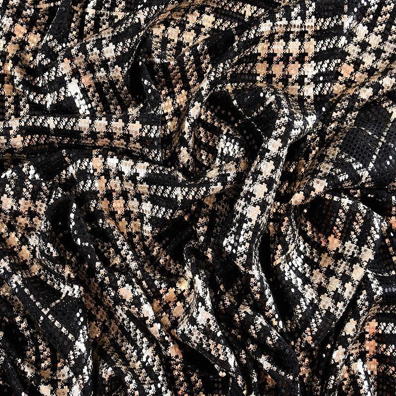 Трикотажное черное полотно золотистым геометрическим узором и деликатными прозрачными круглыми пайетками. Декор накатан на основу, поэтому будет комфортен в носке. Ткань пластичная, прекрасно драпируется и укладывается в складки, легко садится по фигуре за счёт основы с эластаном, не прозрачная, позволит шить изделия без подклада. Идеально подойдет для пошива нарядных вечерних образов: платья, юбки, топа, туники, широких брюк, жакета, кардигана.