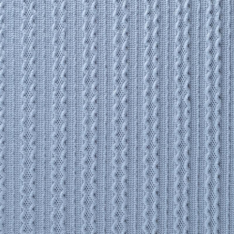 Текстурное вязаное, мягкое, пластичное полотно средней плотности в голубом оттенке. Вязаный узор - стилизованая косичка с полосками расположен по всему полотну. Подойдет для пошива уютного свитера, кардигана, юбки, платья, водолазок, снудов и головных уборов.