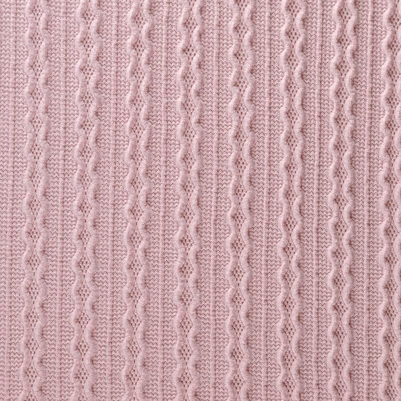 Текстурное вязаное, мягкое, пластичное полотно средней плотности в розовом оттенке. Вязаный узор - стилизованая косичка с полосками расположен по всему полотну. Подойдет для пошива уютного свитера, кардигана, юбки, платья, водолазок, снудов и головных уборов.