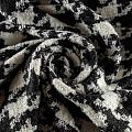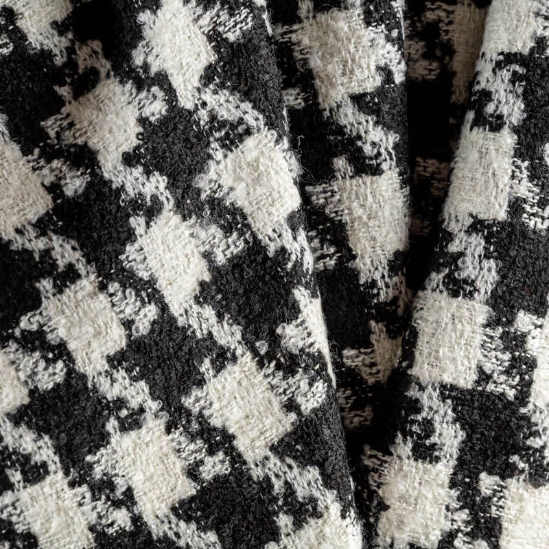 Твид с плетеной и немного буклированной поверхностью, узор "гусиная лапка" образуется переплетением черных и молочных нитей. Ткань не сухая, мягкая, но плотная, не просвечивает, теплая, хоршо драпируется. Отлично подойдет для пошива верхней одежды, жакетов, костюмов, юбок.