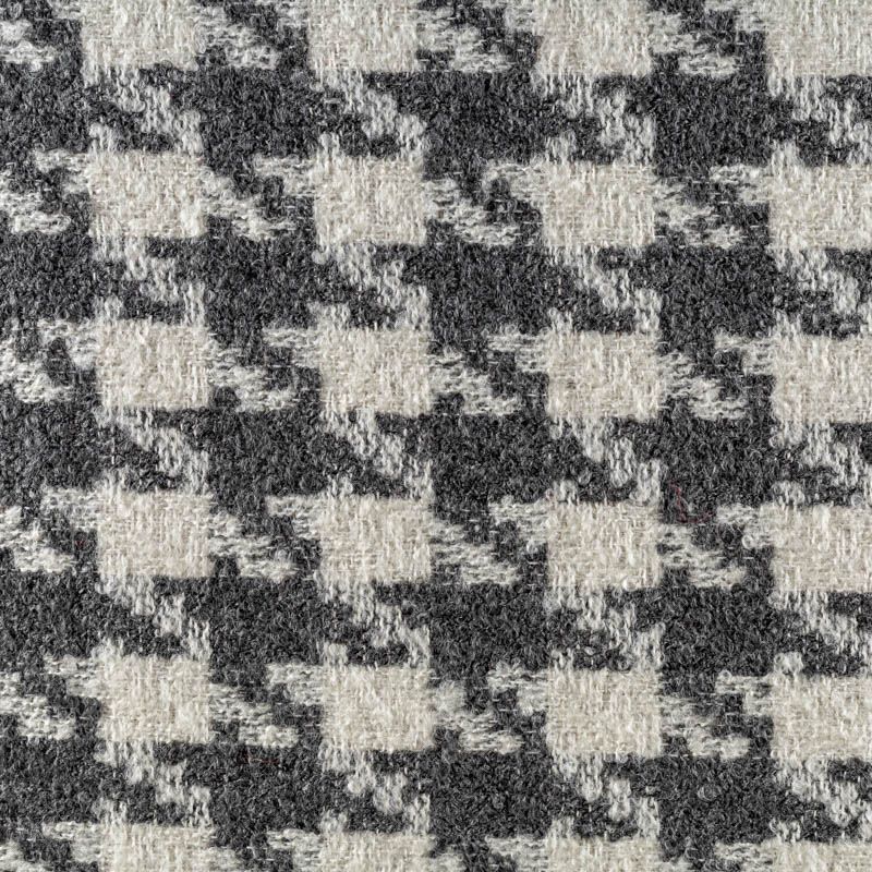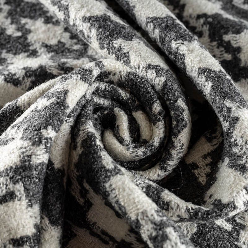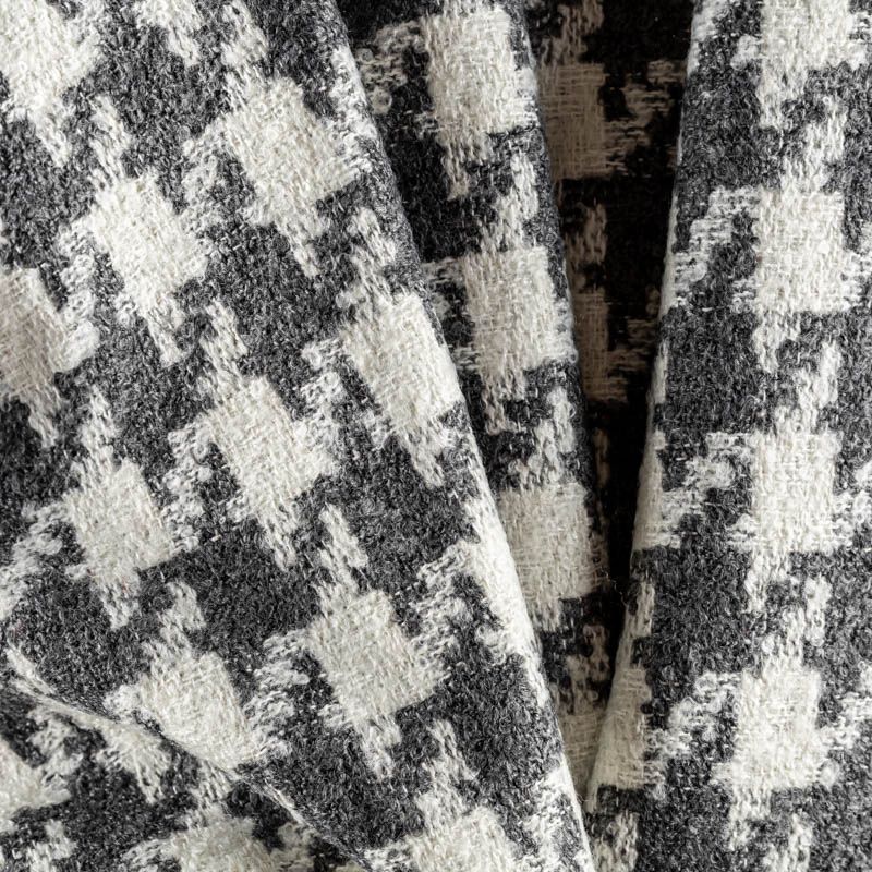 Твид с плетеной и немного буклированной поверхностью, узор "гусиная лапка" образуется переплетением серых и молочных нитей. Ткань не сухая, мягкая, но плотная, не просвечивает, теплая, хоршо драпируется. Отлично подойдет для пошива верхней одежды, жакетов, костюмов, юбок.
