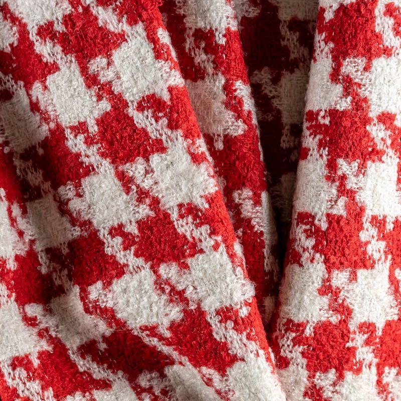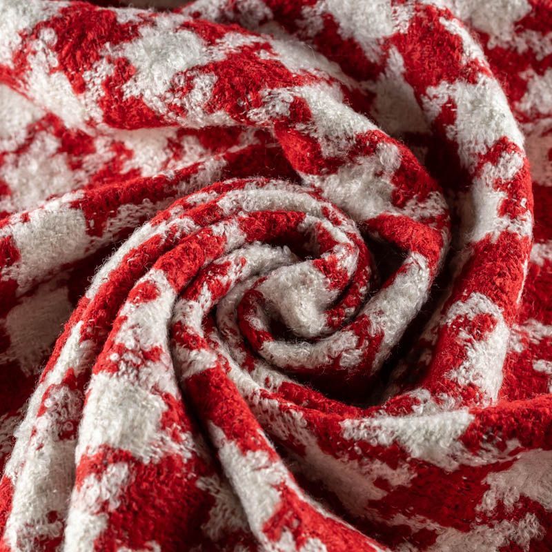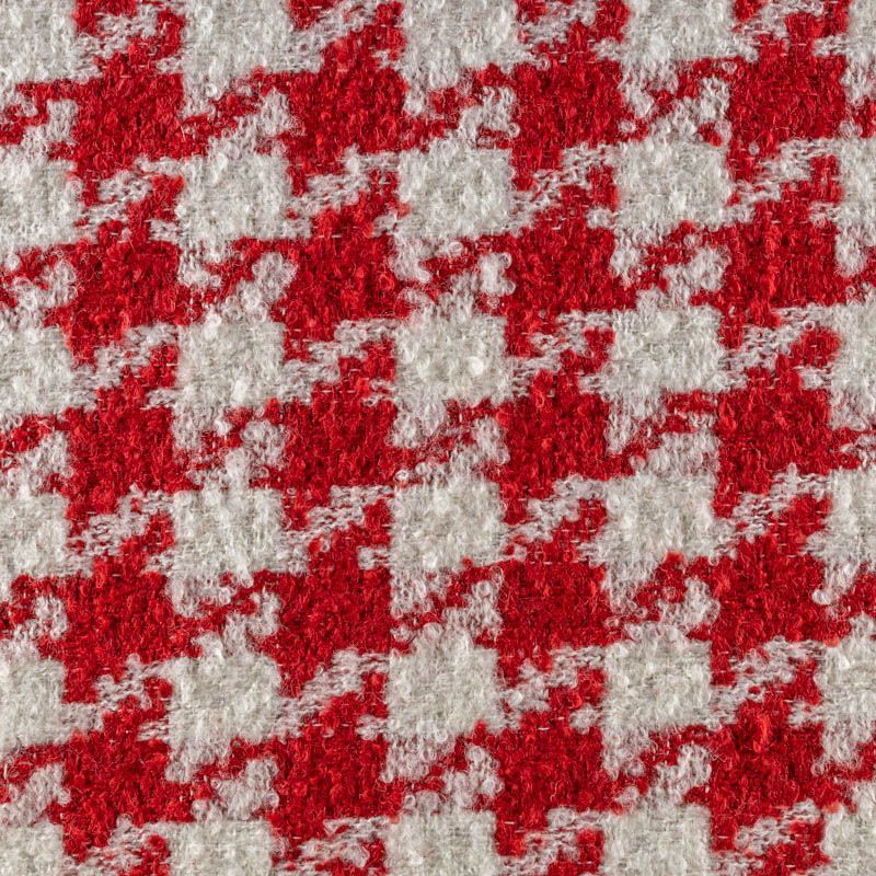 Твид с плетеной и немного буклированной поверхностью, узор "гусиная лапка" образуется переплетением красных и молочных нитей. Ткань не сухая, мягкая, но плотная, не просвечивает, теплая, хоршо драпируется. Отлично подойдет для пошива верхней одежды, жакетов, костюмов, юбок.