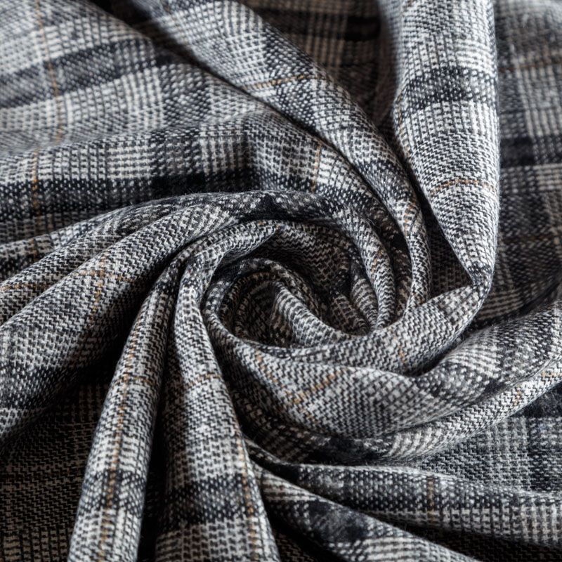Фактурная и плотная твидовая ткань с добавлением хлопка в красивую черно-белую клетку с бежевой тонкой полоской. Ткань мягкая, пластичная, приятная на ощупь. Хорошо драпируется и образует формоустойчивые складки. Твид отлично подходит для пошива костюмов, пальто, пиджаков, брюк и курток, юбок, жилетов, головных уборов в классическом стиле.