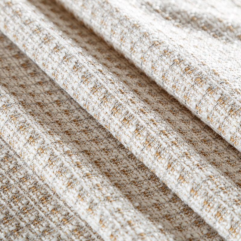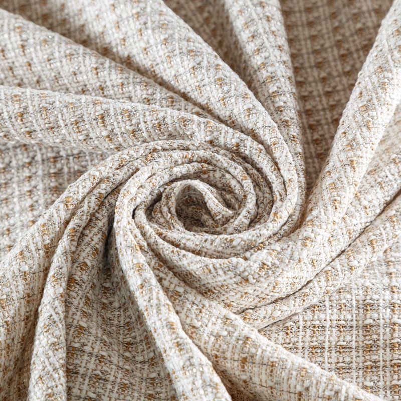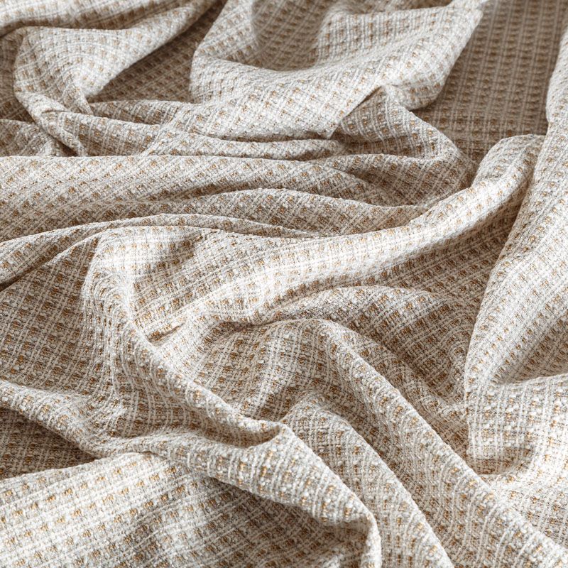 Отличительная особенность этой ткани в полотняном плетении нитей, характерного для рогожки, олицетворяющая сложную "клетчатую" геометрию в бежево-молочных оттенках. Различная толщина нитей создает эффектную фактуру. Ткань достаточно формоустойчивая, при этом пластичная, гибкая за счет плетения,  матовая, мягкая, приятная на ощупь, не рыхлая. Прекрасно подойдет для пошива жакета, юбки в виде трапеции, легкого пальто, костюма.