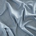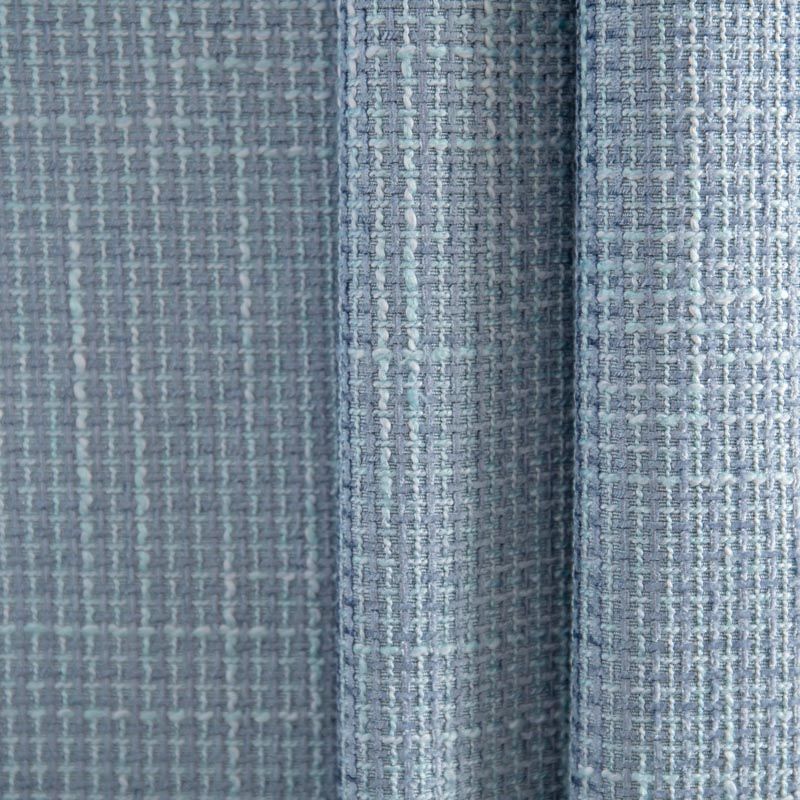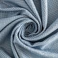 Отличительная особенность этой ткани в полотняном плетении нитей, характерного для рогожки, олицетворяющая сложную "клетчатую" геометрию в нежных голубых оттенках. Различная толщина нитей создает эффектную фактуру. Ткань достаточно формоустойчивая, при этом пластичная, гибкая за счет плетения,  матовая, мягкая, приятная на ощупь, не рыхлая. Прекрасно подойдет для пошива жакета, юбки в виде трапеции, легкого пальто, костюма.