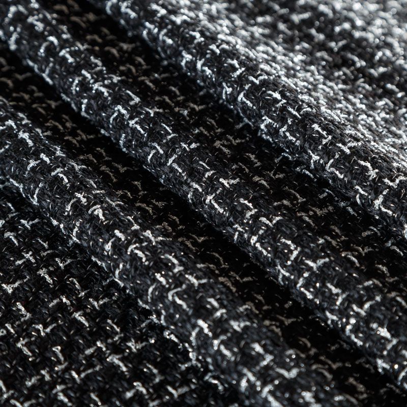Мягкая, пластичная и объемная ткань, с разреженной и рельефной вывязанной структурой. Буклированный твид в стиле Шанель буквально соткан из различных по толщине и текстуре нитей, образующих рисунок в виде клетки. В плетение добавлена блестящая люрексная нить. Твид идеально подходит для пошива платьев, юбок, жакетов, легких пальто, эффектных бомберов и курток.