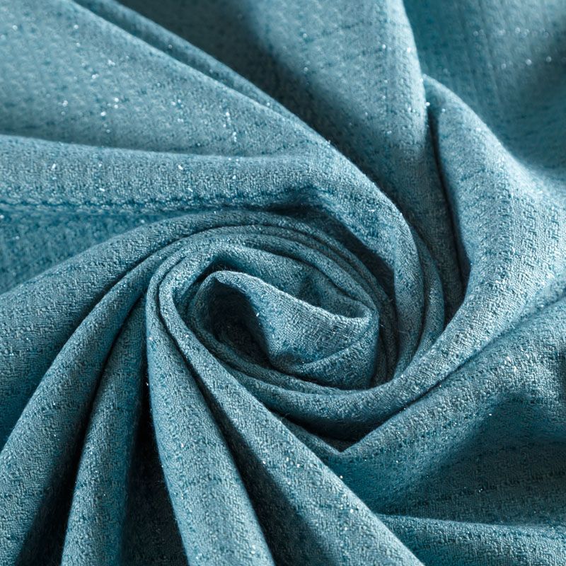 Твид средней плотности с рельефной поверхностью бирюзового оттенка с добавлением акцента в виде люрексовой нити, которая имитирует клетку и добавляет ткани нарядности. Твид пластичный, хорошо драпируется, умеренно держит форму, прекрасно подойдет для пошива жакетов на подкладе, жилетов, кардиганов, легких пальто, юбок и платьев.