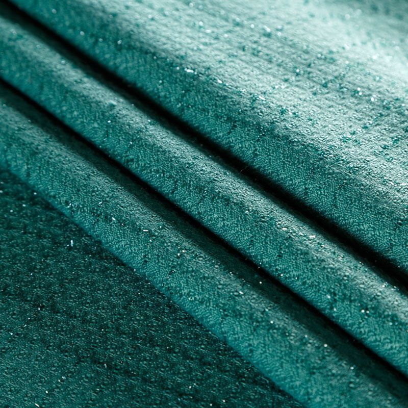 Твид средней плотности с рельефной поверхностью зеленого оттенка с добавлением акцента в виде люрексовой нити, которая имитирует клетку и добавляет ткани нарядности. Твид пластичный, хорошо драпируется, умеренно держит форму, прекрасно подойдет для пошива жакетов на подкладе, жилетов, кардиганов, легких пальто, юбок и платьев.