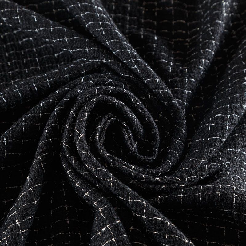 Мягкая, пластичная и объемная ткань, с разреженной и рельефной вывязанной структурой. Буклированный твид в стиле Шанель буквально соткан из различных по толщине и текстуре нитей, образующих рисунок в виде клетки. В плетение добавлена блестящая люрексная нить. Твид идеально подходит для пошива платьев, юбок, жакетов, легких пальто, эффектных бомберов и курток