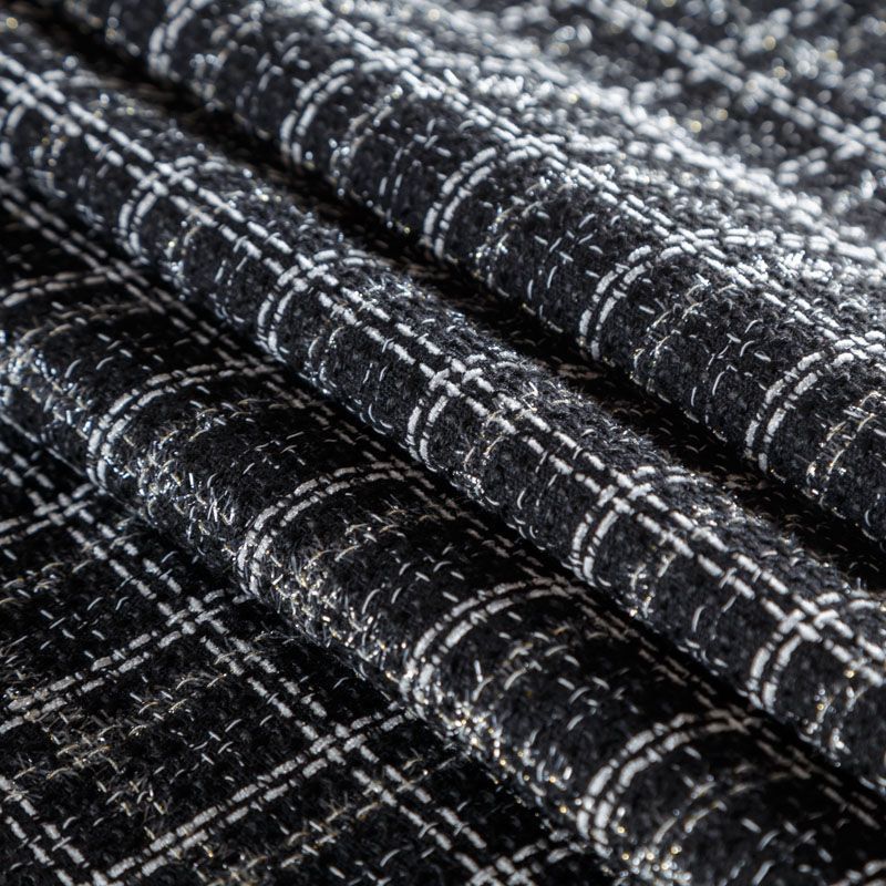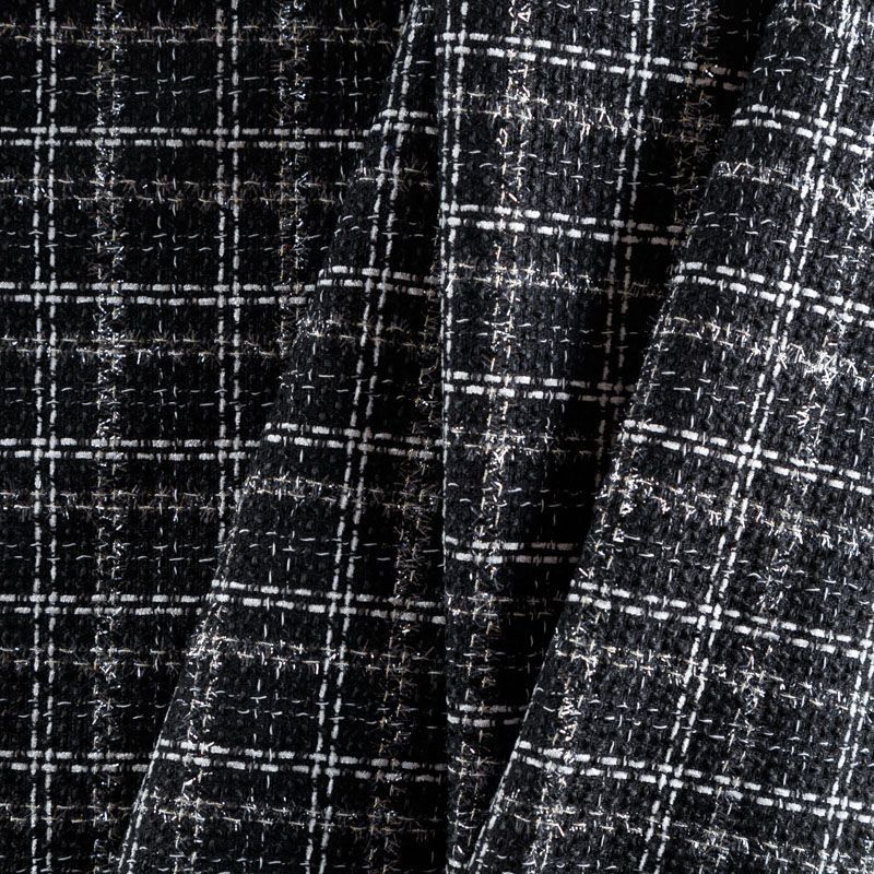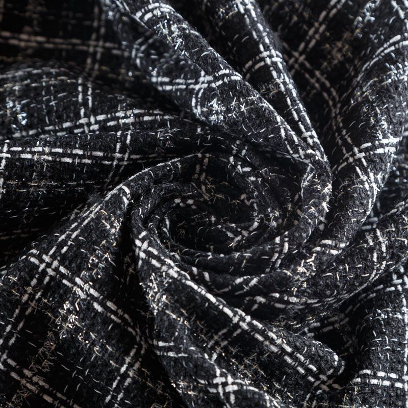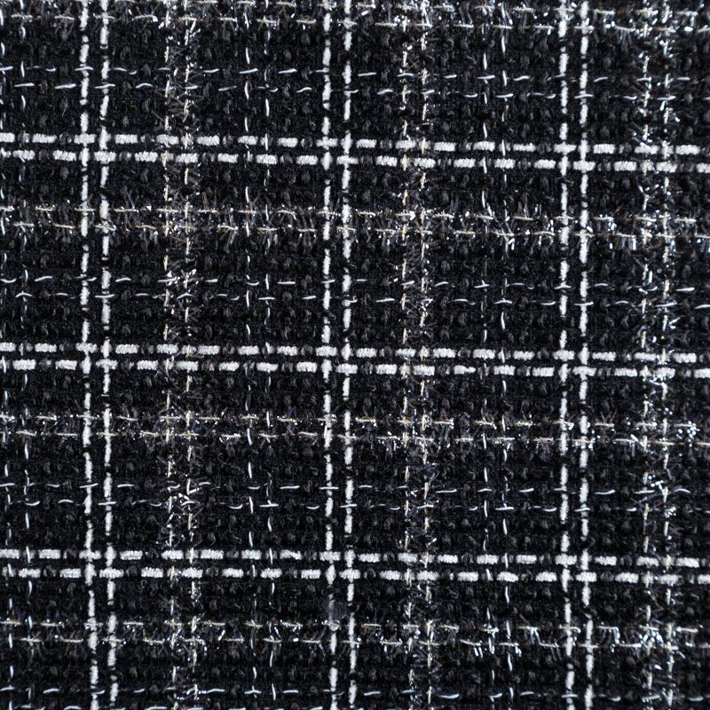 Мягкая, пластичная и объемная ткань, с разреженной и рельефной вывязанной структурой. Буклированный твид в стиле Шанель буквально соткан из различных по толщине и текстуре нитей, образующих рисунок в виде клетки. В плетение добавлена блестящая люрексная нить. Твид идеально подходит для пошива платьев, юбок, жакетов, легких пальто, эффектных бомберов и курток.