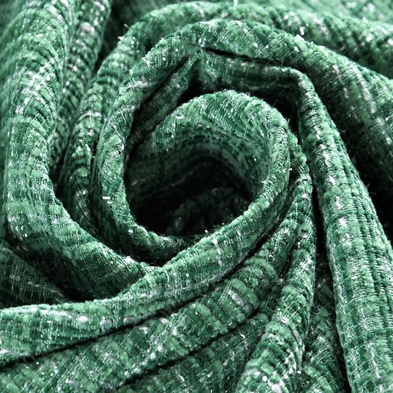 Мягкая, пластичная и объемная ткань, с разреженной и рельефной вывязанной структурой. Буклированный твид в стиле Шанель буквально соткан из различных по толщине и текстуре нитей, образующих рисунок в виде клетки. В плетение добавлена блестящая люрексная нить. Твид идеально подходит для пошива платьев, юбок, жакетов, легких пальто, эффектных бомберов и курток.