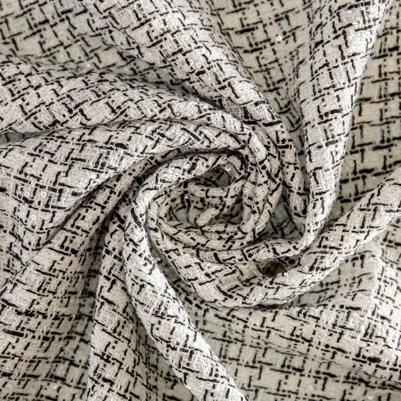 Мягкая, пластичная и объемная ткань, с разреженной и рельефной вывязанной структурой. Буклированный твид в стиле Шанель буквально соткан из различных по толщине и цвету нитей, образующих рисунок в виде клетки. В плетение добавлена серебристая люрексная нить, а также мелкие пайетки. Твид идеально подходит для пошива платьев, юбок, жакетов и легких пальто в стиле Шанель.