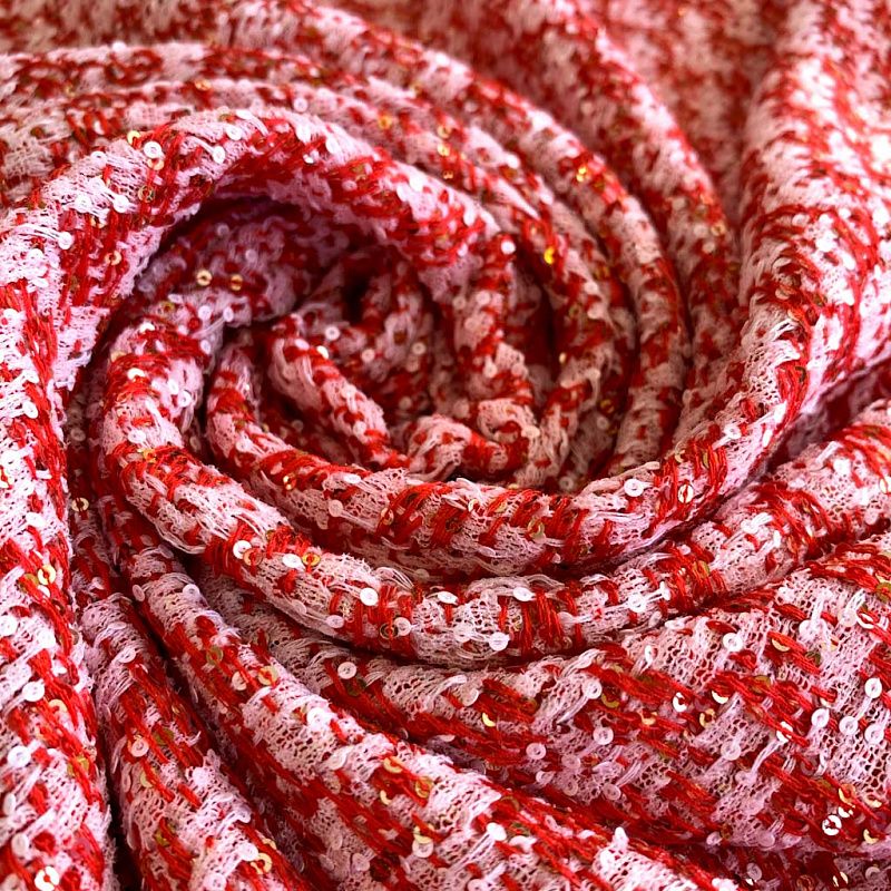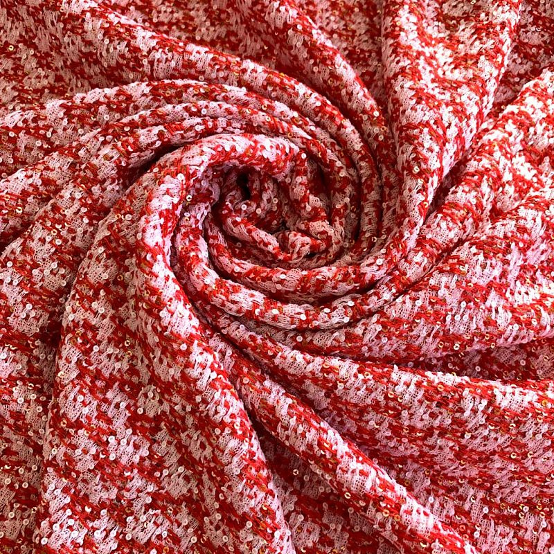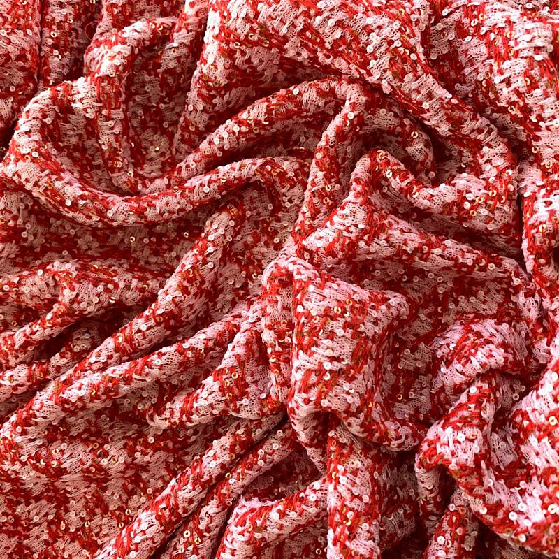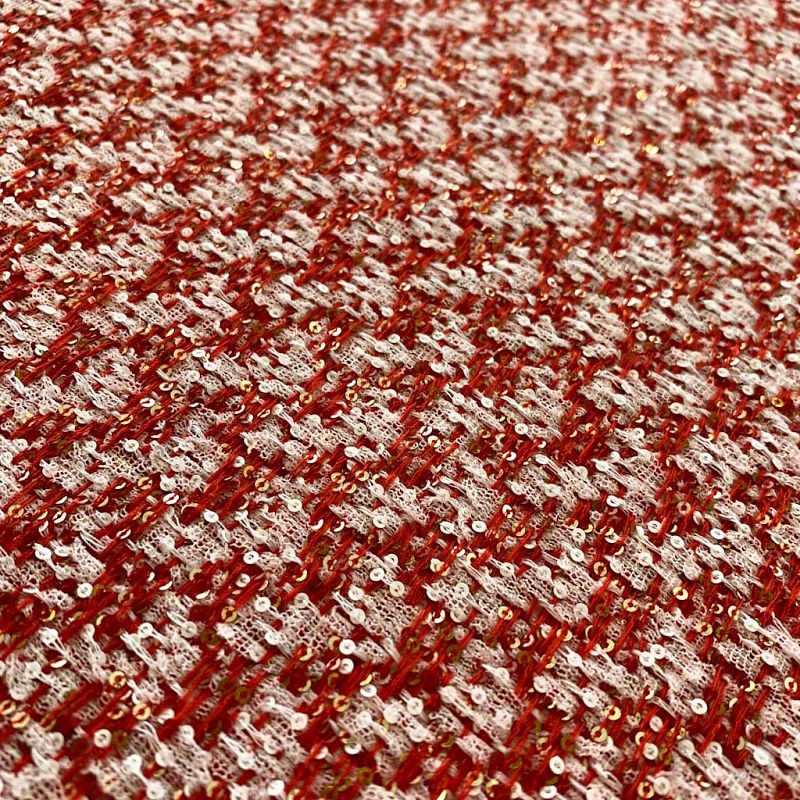 Безумно нарядный натуральный твид. Плотный, хорошо драпируется и держит форму. Переплетение красных и белых нитей образуют геометрический орнамент. Кроме этого полотно украшено мелкими пайетками, которые придают ткани блеск и нарядность.Ткань выглядит очень богато, элегантно, прекрасно подчеркивает женственность и подходит для разных луков. Это может быть укороченный жакет к вечернему платью, или повседневный костюм, летнее пальто, юбка и др.