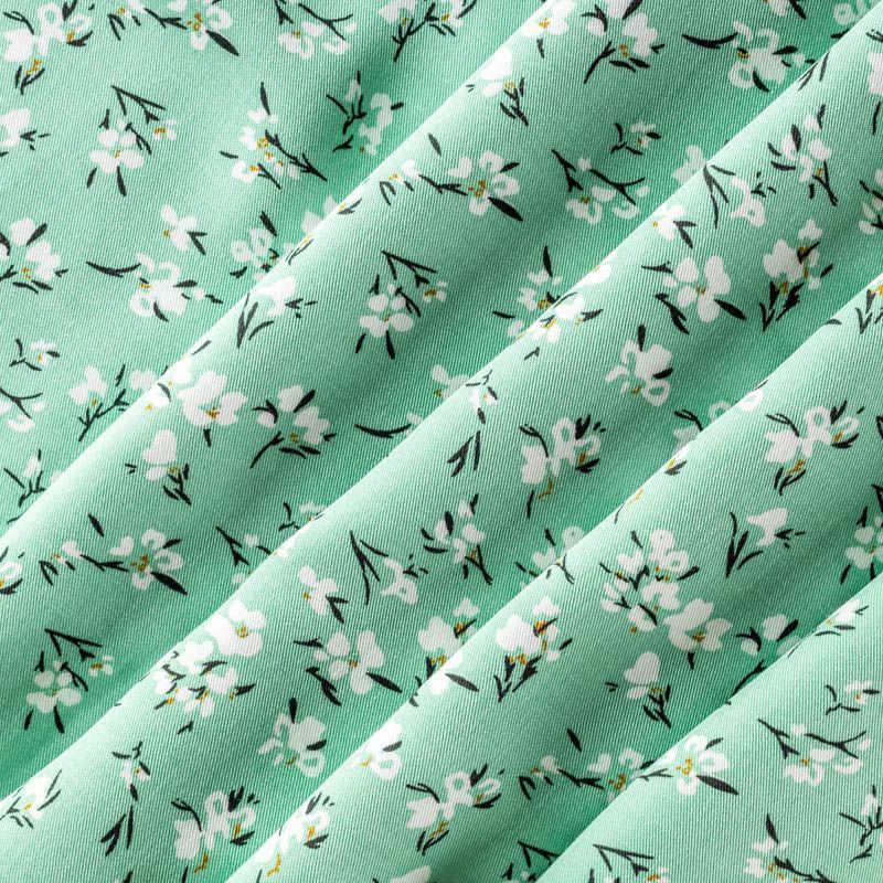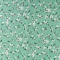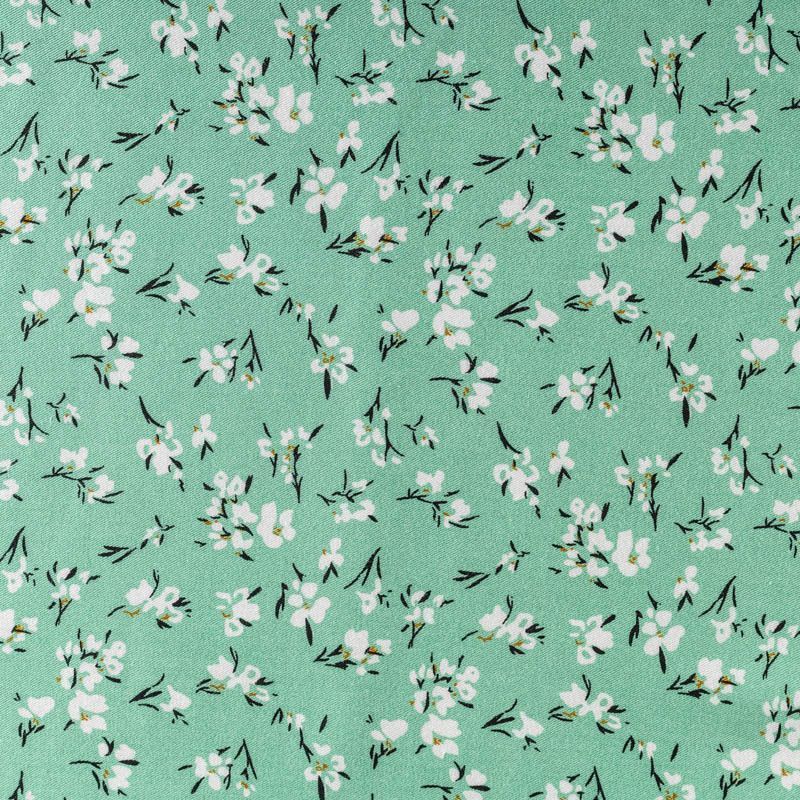 Качественный вискозный твил-штапель с нежным принтом из мелких цветочков на приятном освежающем фоне цвета нефрита. Мягкая ткань средней плотности, имеет саржевое плетение и характерный диагональный рубчик на поверхности. Хорошо сохраняет форму, не сильно мнется и не деформируется в процессе эксплуатации.  Красиво ложится в складки, поэтому прекрасно подойдет на длинные драпированные юбки и платья, туники, на свободные брюки или шорты, топы.