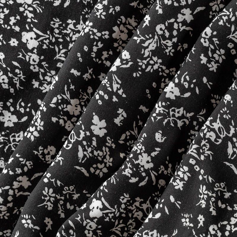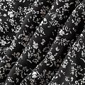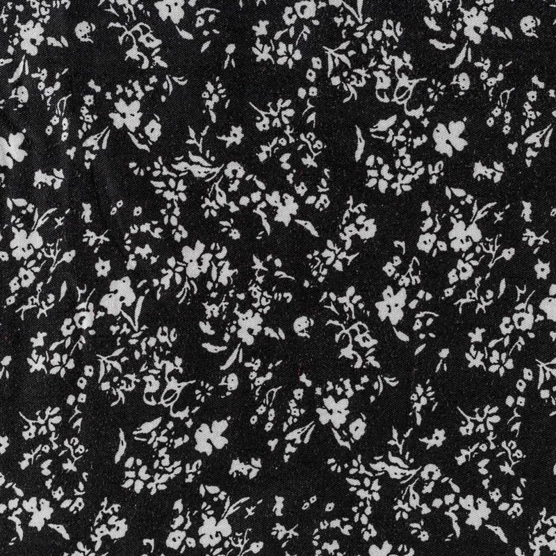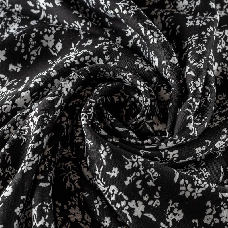 Качественный вискозный твил-штапель с нежным принтом из мелких букетиков на контрастном черном фоне. Мягкая ткань средней плотности, имеет саржевое плетение и характерный диагональный рубчик на поверхности. Хорошо сохраняет форму, не сильно мнется и не деформируется в процессе эксплуатации.  Красиво ложится в складки, поэтому прекрасно подойдет на длинные драпированные юбки и платья, туники, на свободные брюки или шорты, топы.