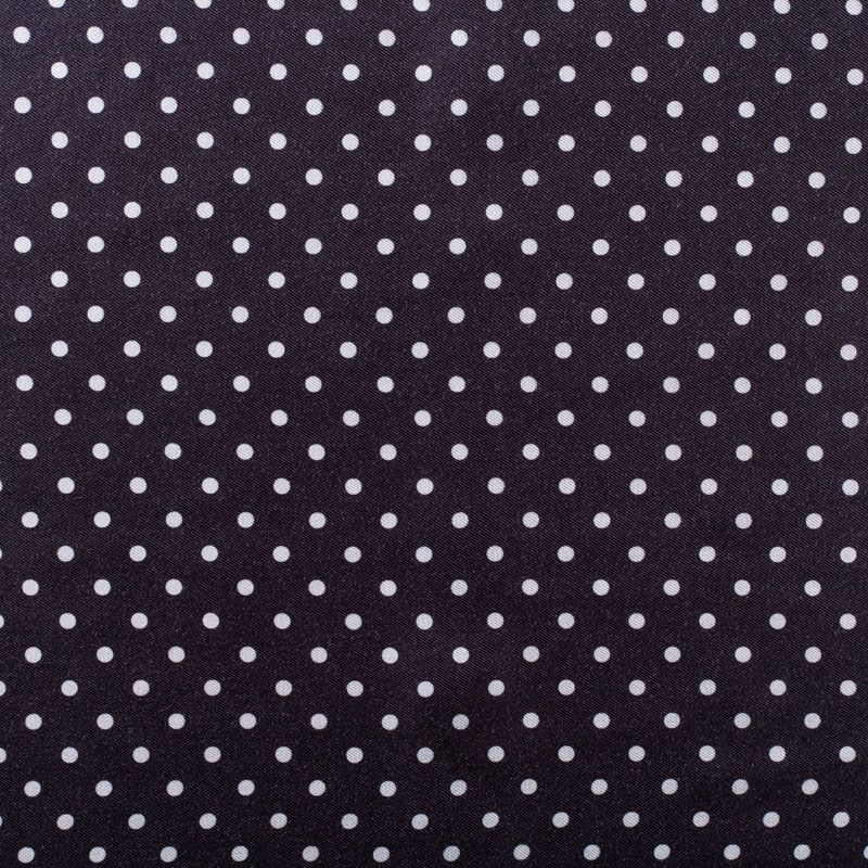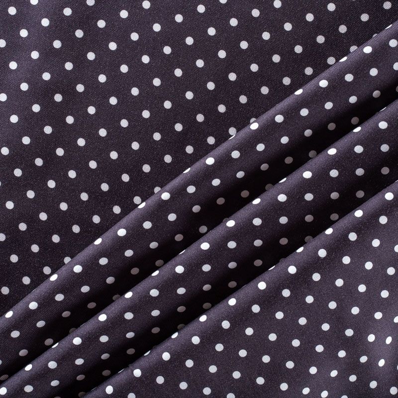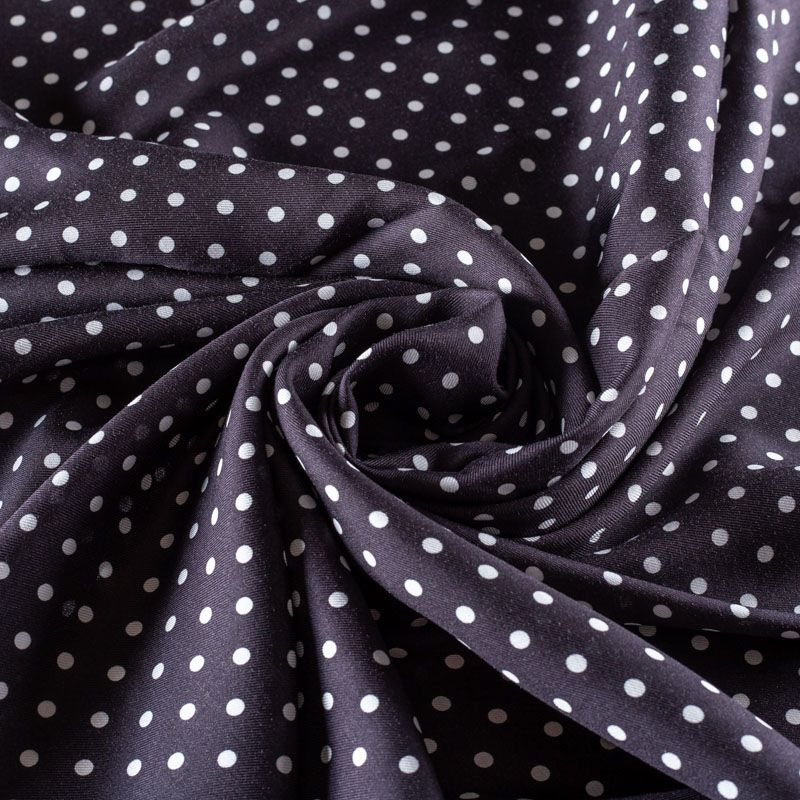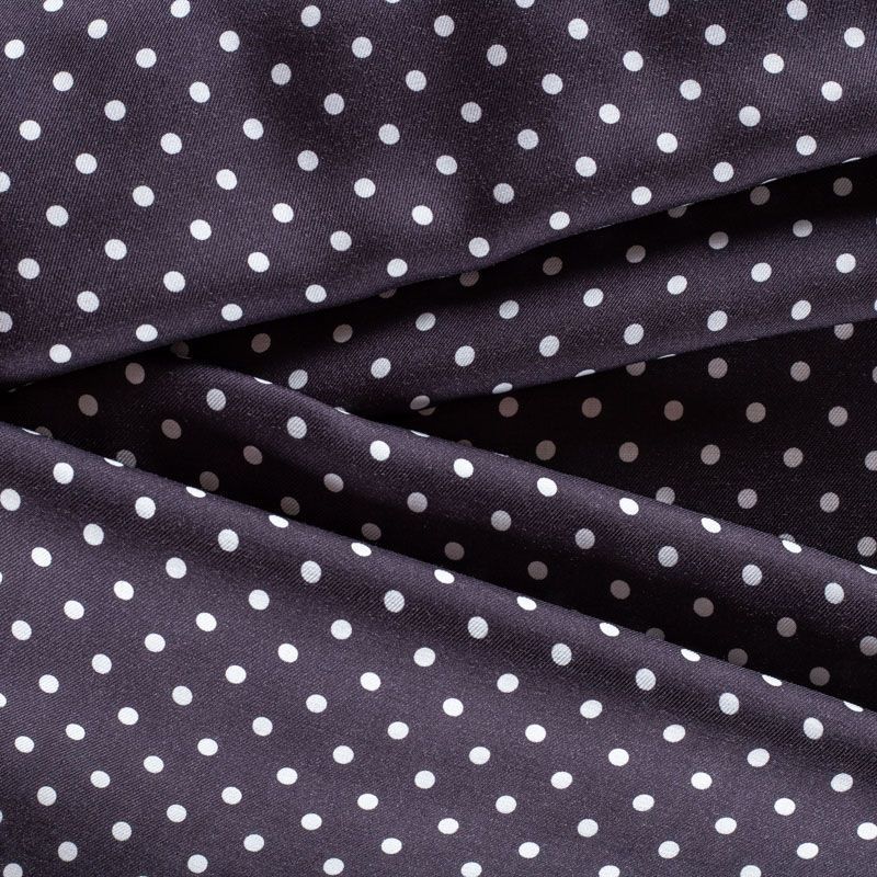 Плотная и мягкая ткань, имеет саржевое плетение и характерный диагональный рубчик на поверхности. Отлично сохраняет форму, не сильно мнется и не деформируется в процессе эксплуатации.  Красиво ложится в складки, поэтому прекрасно подойдет на длинные драпированные юбки и платья, на свободные брюки или шорты, топы. Размер горошка - 0,5 см