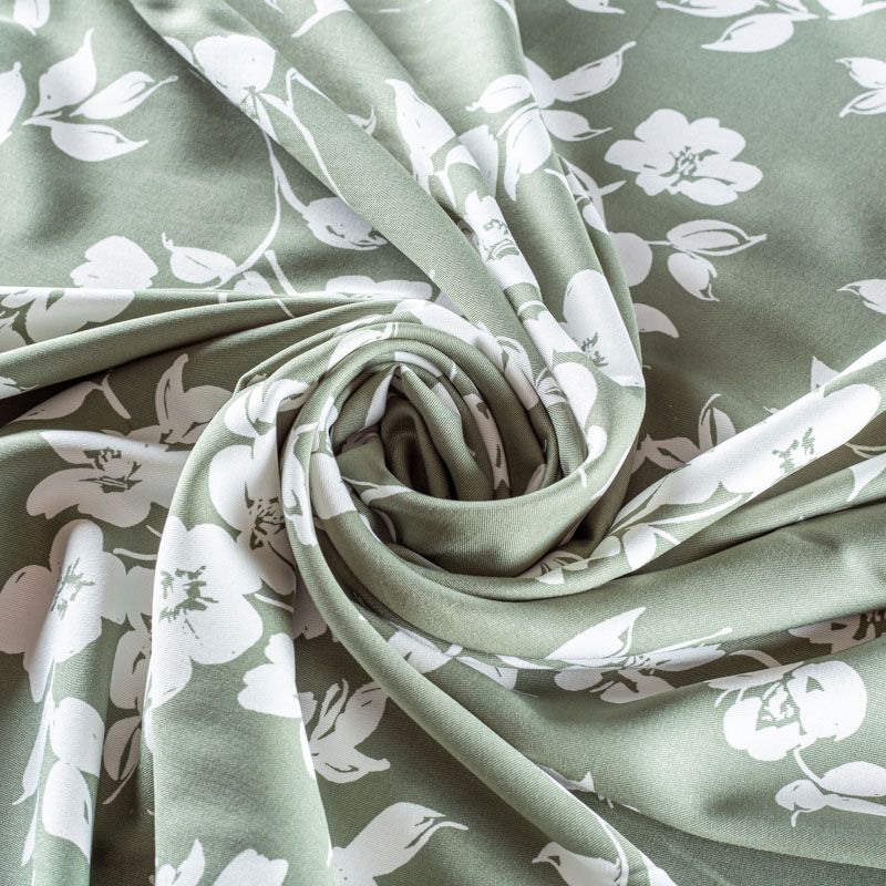 Качественный твил-штапель с белым цветочным принтом на фисташковом фоне. Мягкая ткань средней плотности, имеет саржевое плетение и характерный диагональный рубчик на поверхности. Хорошо сохраняет форму, не сильно мнется и не деформируется в процессе эксплуатации.  Красиво ложится в складки, поэтому прекрасно подойдет на длинные драпированные юбки и платья, на свободные брюки или шорты, топы.