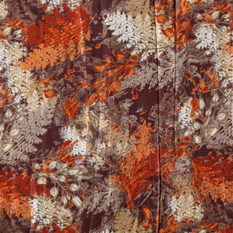 Плотная и мягкая ткань шоколадного оттенка с растительным принтом, имеет саржевое плетение и характерный диагональный рубчик на поверхности. Отлично сохраняет форму, не сильно мнется и не деформируется в процессе эксплуатации. Красиво ложится в складки, поэтому прекрасно подойдет на длинные драпированные юбки и платья, на свободные брюки или шорты, топы.